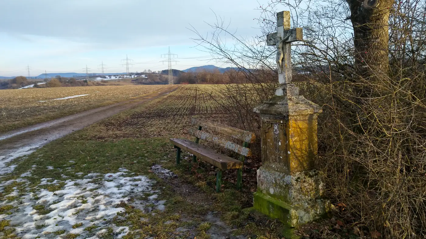 Vom Wasserfall aus führt der Weg steil bergab zu den Weihern am Mühlenbach. Hier beruhigt sich das Wasser, und die Landschaft öffnet sich spürbar. Gitterstege leiten uns über feuchtes, sumpfiges Gelände, während Uferpflanzen, offene Flächen und ruhige Sitzplätze dazu einladen, die Wanderung noch einmal bewusst zu genießen. Schließlich verlassen wir das Mühlenbachtal und steigen hinauf in Richtung Weigheim. An der Bushaltestelle Kirche endet unsere Tour harmonisch zwischen Wasser, Natur und weiter Landschaft.Diese Tour wurde am 24.01.2026 von einer realen Person erwandert, fotografiert und beschrieben. Die GPS-Daten der Fotos wurden vor Ort erfasst und dienten zur exakten Rekonstruktion der Route.
