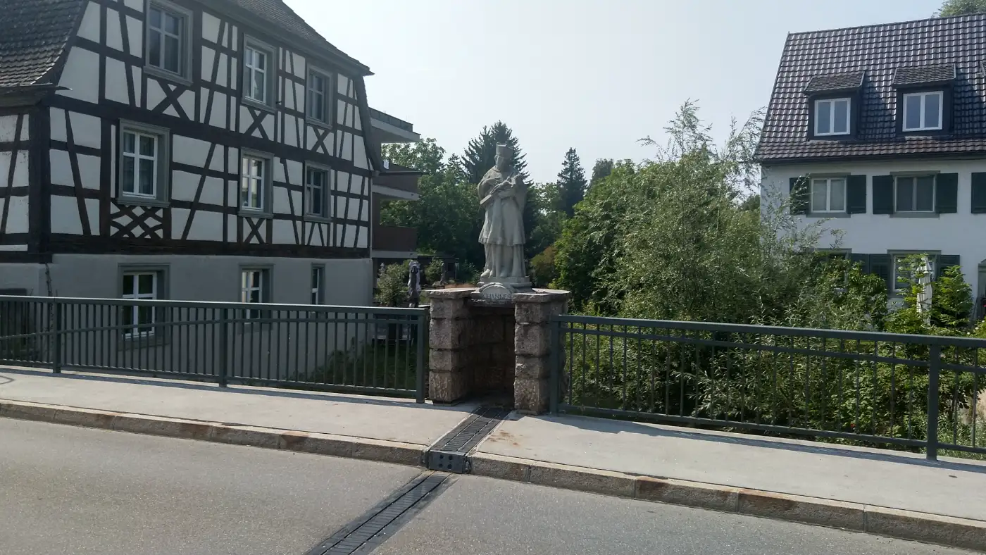 Nach wenigen Schritten stehen wir auf der Aachbrücke mit der Figur des Hl. Nepomuk. Unter uns zieht die Aach still dahin, und für einen Moment verweilen wir, um die friedliche Flusslandschaft zu betrachten. Wir verweilen kurz, beobachten das Wasser, das durch die Landschaft zieht, und lassen die Atmosphäre des Ortes auf uns wirken. Die Brücke ist nicht nur eine Verbindung zwischen den Ufern, sondern auch ein sinnbildlicher Übergang vom Alltag hinein in unsere Wanderung.Stationenweg durch Bohlinger Schlucht