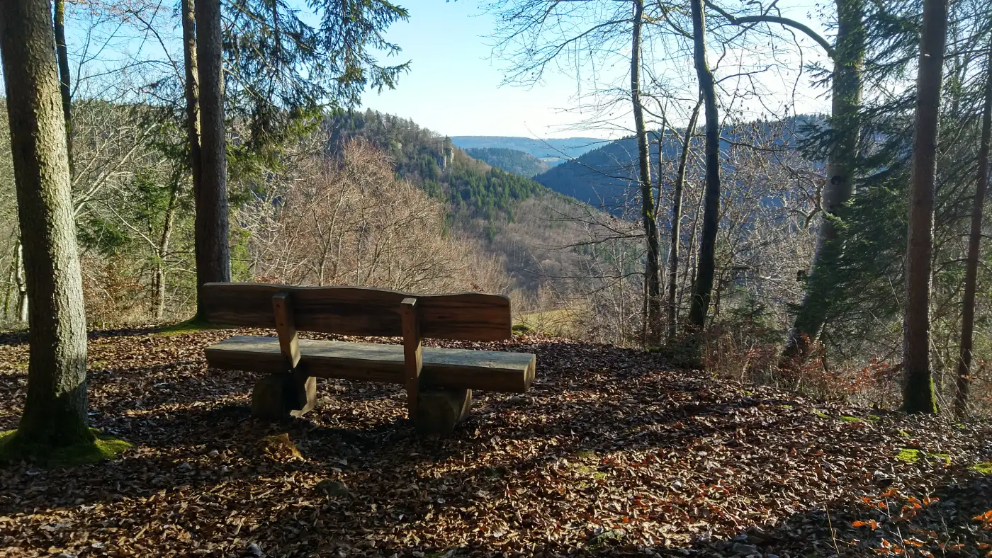 Unser Weg führt uns oberhalb des Ursentals entlang, das sich an einer Aussichtsbank plötzlich still und abgeschieden vor uns öffnet. Von hier aus schweift der Blick durch das Ursental, und am Horizont lässt sich sogar das Donautal erahnen. Wir wandern weiter auf der schmalen Bergkante durch lichten Buchenwald, begleitet vom Zwitschern der Vögel. Die sanften Linien der Landschaft und die spürbare Ruhe machen diesen Abschnitt zu einem besonders erholsamen Teil unserer Wanderung.Ruine Wallenburg