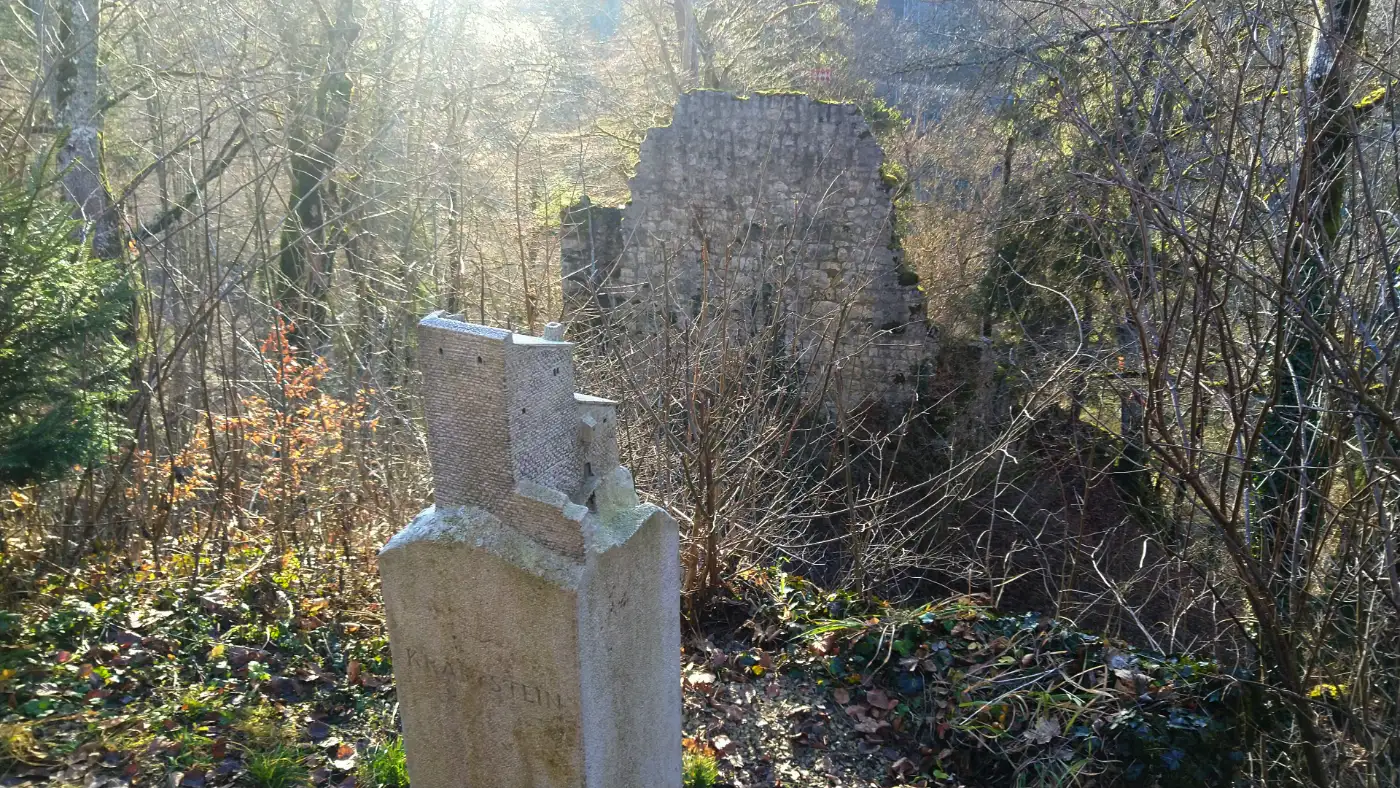 Um zur Bräunlinsburg zu gelangen, steigen wir zunächst ins Ursental ab. Die ehemalige Burganlage liegt auf der gegenüberliegenden Talseite auf einem bewaldeten Höhenrücken. Der anschließende Zickzack-Aufstieg ist der wohl anspruchsvollste Abschnitt unserer Wanderung, denn der Pfad ist besonders steil und kann bei Nässe durch lehmigen Untergrund sehr rutschig werden. Oben angekommen sind von der Bräunlinsburg nur noch wenige Spuren erhalten. Zwei Aussichtsbänke am Felsenrand verleihen dem Ort dennoch einen besonderen Reiz. Wir nehmen uns Zeit, die ruhige, fast vollständige Stille fernab jeglicher Zivilisation zu genießen, bevor wir unseren Weg in Richtung Kraftstein fortsetzen.Ruine Kraftstein