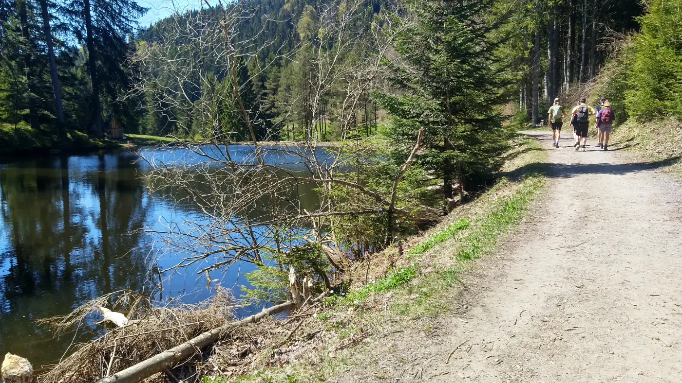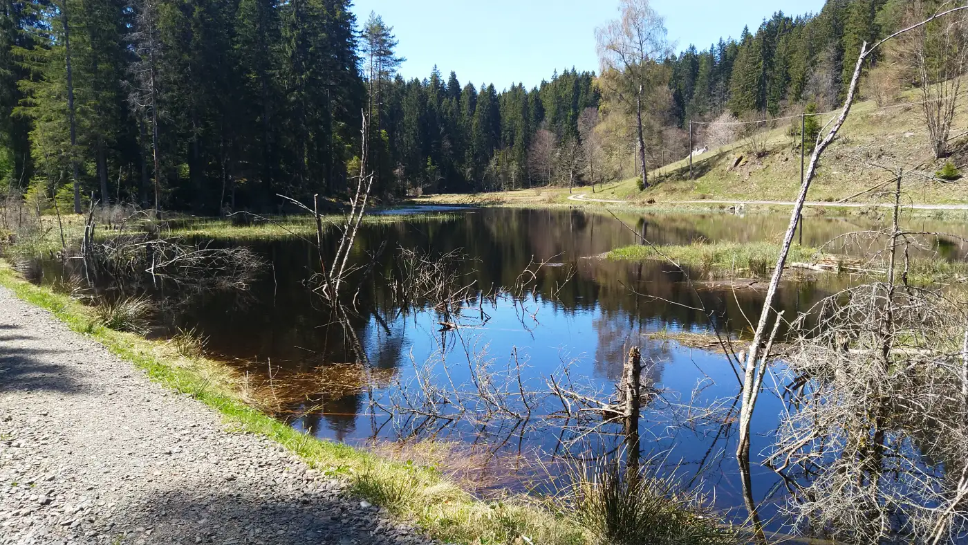Wir starten unsere Wanderung am Bahnhof von Hinterzarten und gehen von dort in Richtung Kurhaus, wo der Einstieg in den SĂ€belthomaweg beginnt. Der gut ausgeschilderte Premiumweg fĂŒhrt uns zunĂ€chst durch lichte WĂ€lder und sanfte HöhenzĂŒge des Hochschwarzwalds. Schon nach wenigen Schritten mischen sich klare Waldluft und erste weite Ausblicke zu einer typischen Schwarzwaldkulisse, die diesen Abschnitt prĂ€gt. Der Weg verlĂ€uft abwechslungsreich und öffnet immer wieder kleine Sichtfenster in die umliegende Landschaft.Weg zum Mathisleweiher