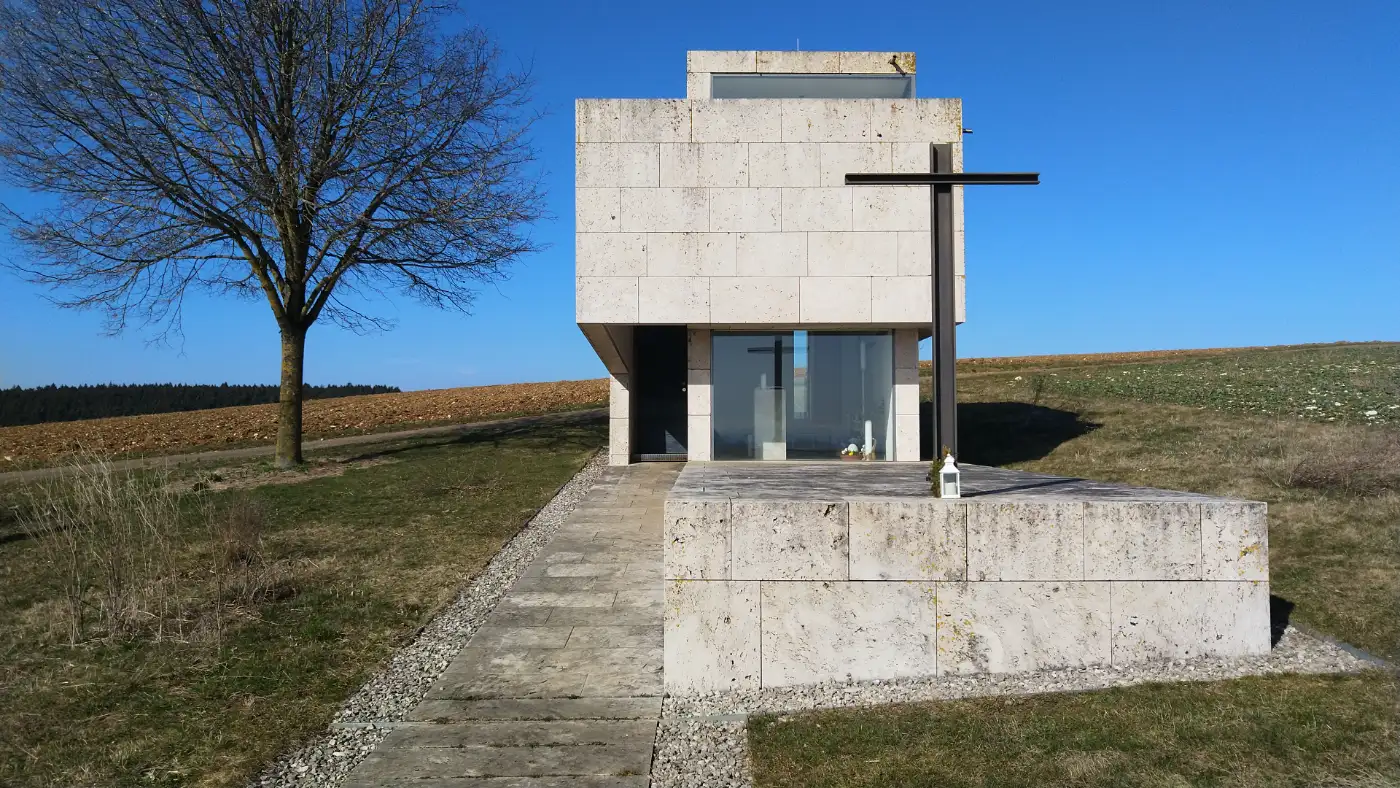 Unser Pfad windet sich stetig bergauf durch den Wald, bis wir schließlich wieder ins Freie treten. Während wir weiter über offene Wiesen an Höhe gewinnen, öffnen sich nach und nach immer weitere Ausblicke. Schon bald schauen wir hinunter auf Hattingen und erkennen in der Ferne die markanten Silhouetten der Hegauberge. Besonders deutlich heben sich der Hohenstoffeln und der Hohenhewen aus der Landschaft heraus. In der entgegengesetzten Richtung erkennen wir die Sendeantenne auf dem Witthoh sowie den hellen Marmorquader der Kapelle St. Johannes und Jakobus.Kapelle St. Johannes und Jakobus
