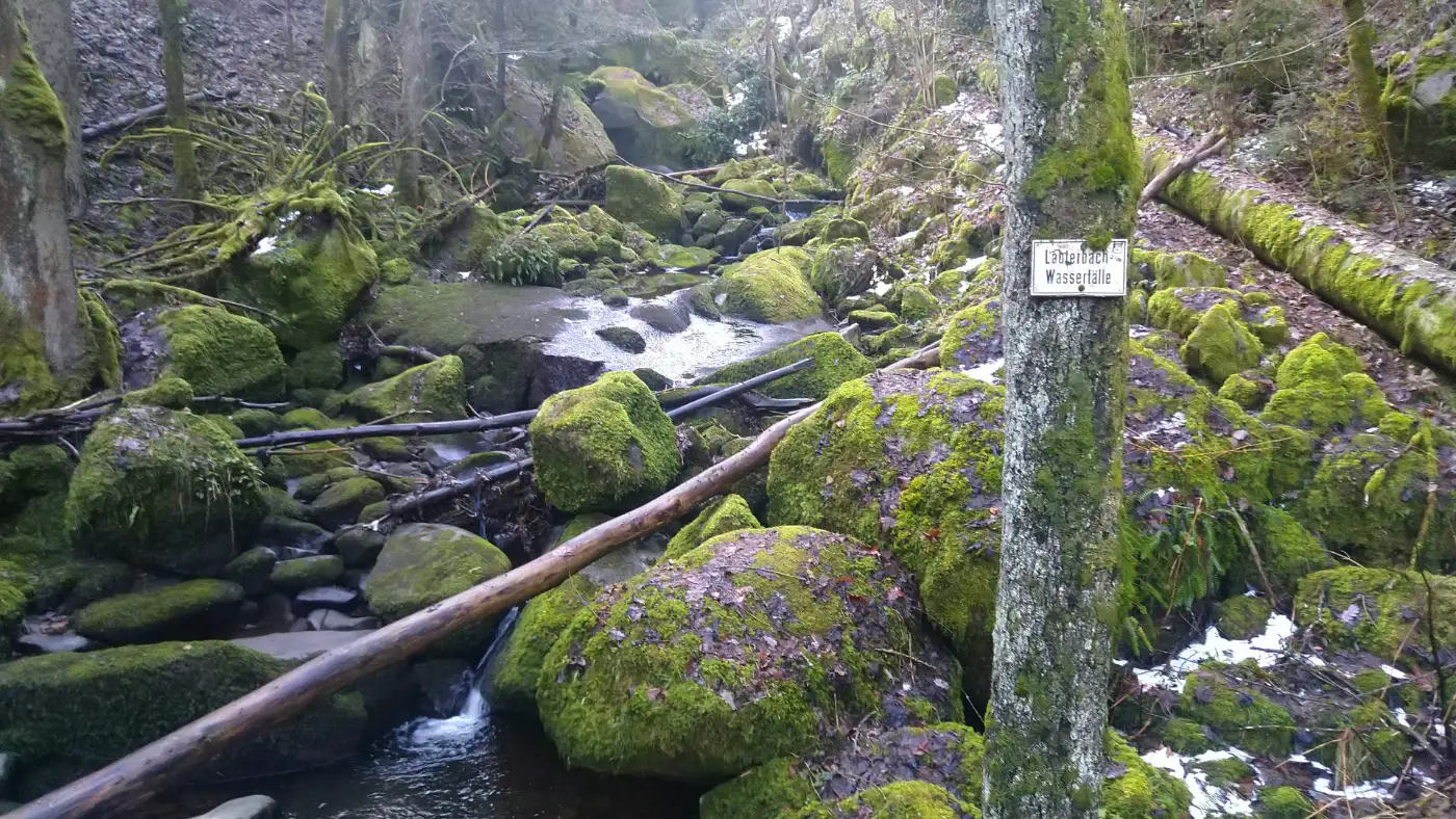 Bald erreichen wir den Lauterbach und folgen seinem Lauf stadtauswärts. Unser Weg verläuft direkt am Wasser entlang, begleitet vom stetigen Rauschen des Bachs. Die Vegetation wird dichter, der Weg schmaler, und die Geräusche der Stadt treten zunehmend in den Hintergrund. Dieser Abschnitt wirkt erfrischend und naturnah.Die Lauterbach Wasserfälle