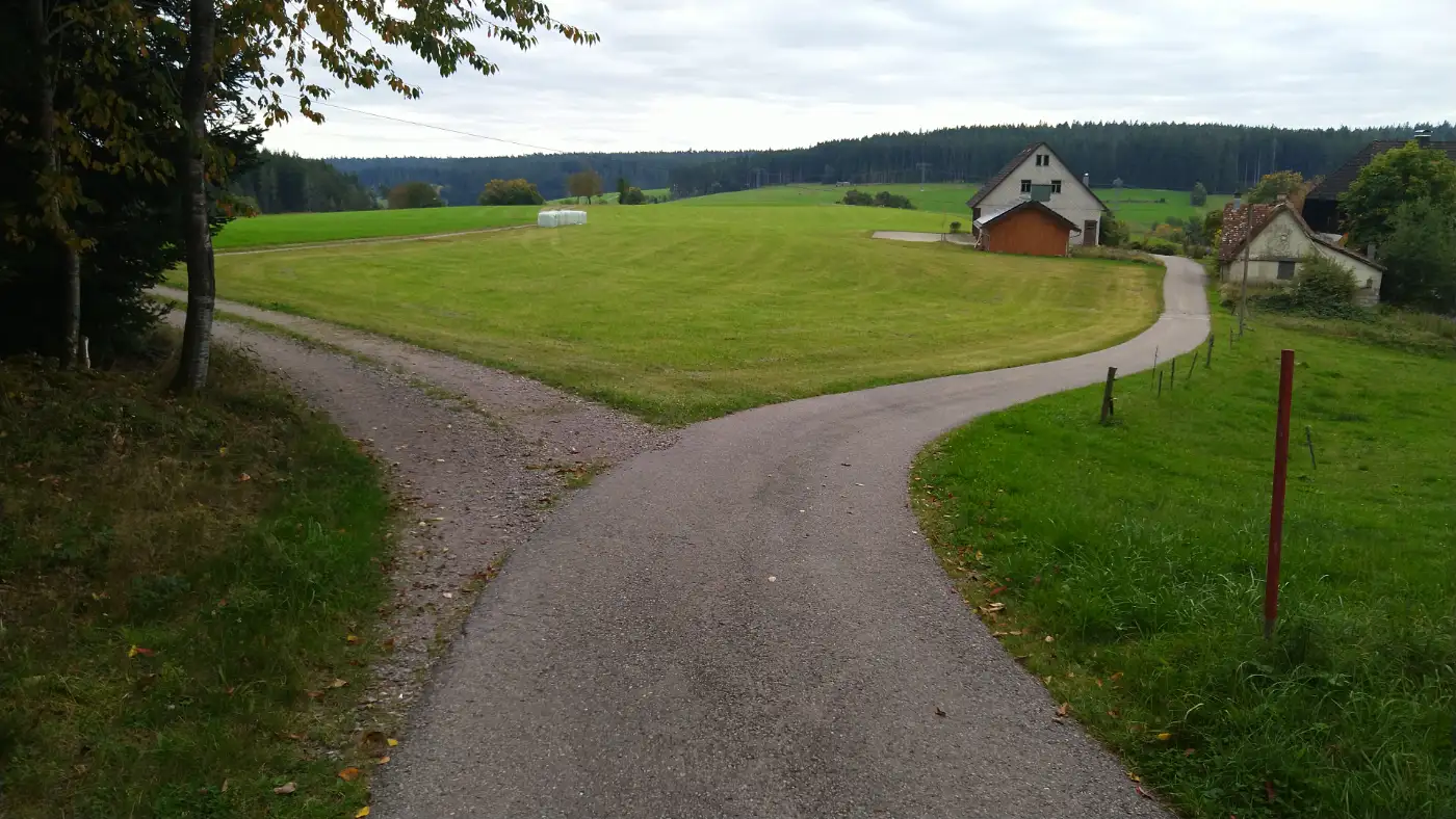 Wanderung durch Hochlagen und Täler mit Schwarzwaldhöfen, Waldwegen und Einkehrmöglichkeit, endet in dörflicher Atmosphäre mit historischem Mühlenplatz. Wir starten am Bahnhof in Sankt Georgen und verlassen den Ort auf einem ruhigen Weg nach Norden in Richtung Schwanenhöhe. Mit jedem Schritt gewinnen wir an Höhe, während sich der Blick auf St. Georgen allmählich öffnet und hinter uns zurückbleibt. Unser Weg verläuft durch lockere Waldpassagen und helle Schneisen, die immer wieder Ausblicke auf die Hochflächen des Schwarzwalds zulassen. Der stetige, angenehme Anstieg bringt uns in einen gleichmäßigen Tritt und stimmt uns auf die weitere Strecke ein.Das Stockwaldtal