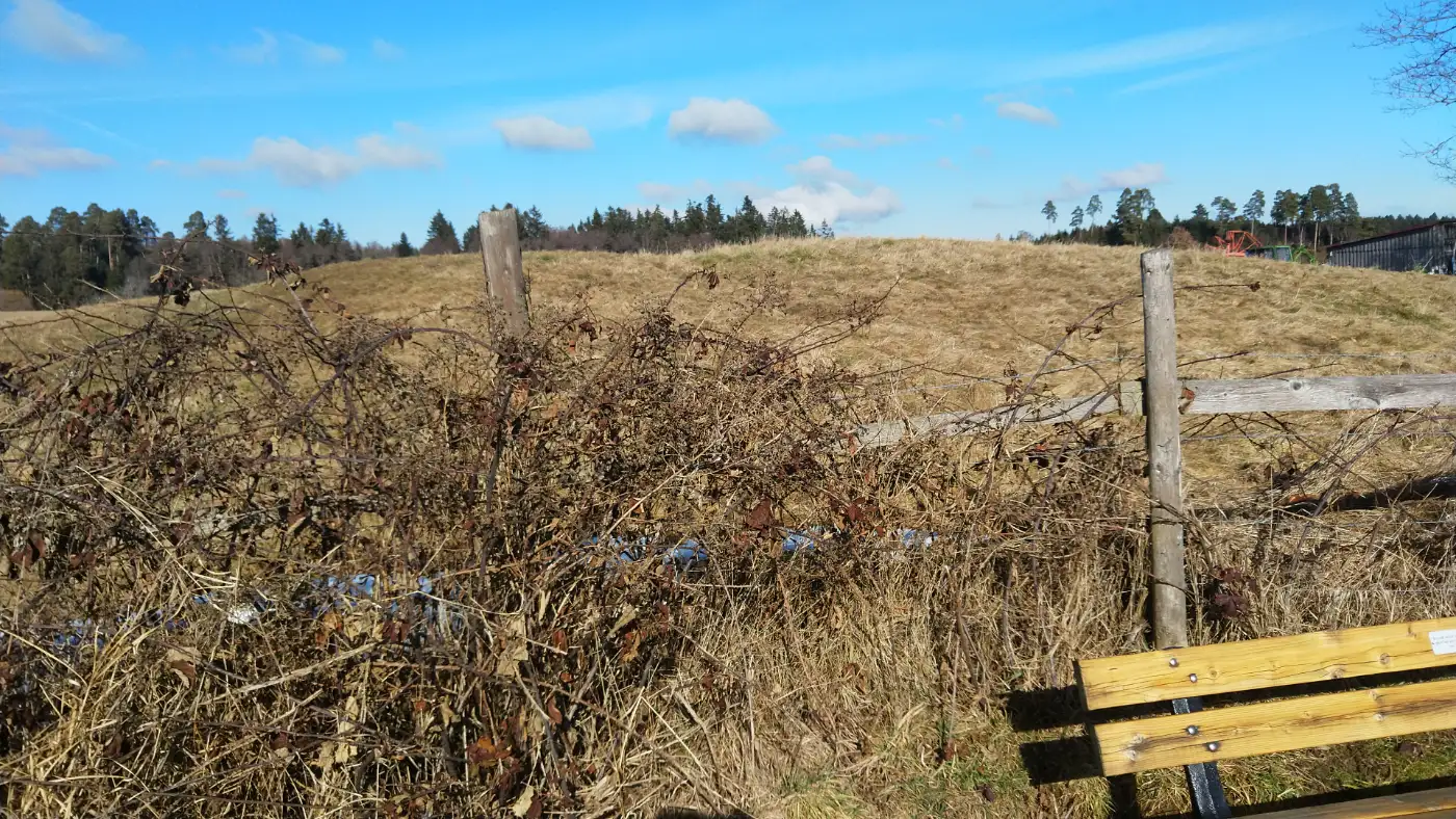 Bald erreichen wir den Dachsbühl, wo sich ein rund 60 Meter breiter und etwa 2 Meter hoher Keltengrabhügel in die Landschaft einfügt. Ursprünglich dürfte er deutlich höher aufgeschüttet gewesen sein und diente vermutlich als Grabstätte einer bedeutenden Persönlichkeit der frühen Keltenzeit. Wir treten näher und erkennen die sanften, heute abgeflachten Formen, die sich nur noch leicht aus dem Gelände herausheben. Trotz ihrer Zurückhaltung wirken sie eindrucksvoll - gerade weil ihre Dimension erst auf den zweiten Blick sichtbar wird. Uns wird bewusst, dass sich unter dieser unscheinbaren Oberfläche wohl noch immer eine aufwendig angelegte Grabkammer verbirgt.Weg zum Alten Schloß