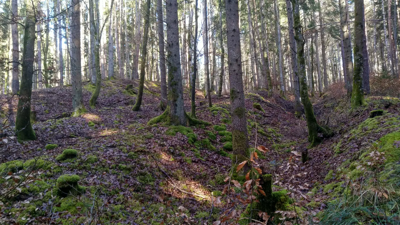 Auf dem Weiterweg fallen uns die markanten Gräben im Wald auf, die sich wie Linien durch das Gelände ziehen. Wir folgen ihnen ein Stück und entdecken, wie sie das Landschaftsbild strukturieren. Ob als ehemalige Befestigungen oder Grenzmarkierungen - sie geben dem Wald eine zusätzliche Tiefe. Während wir weitergehen, verbinden sich Natur und Geschichte zu einem stimmigen Abschluss unserer Wanderung.Diese Tour wurde am 08.02.2026 von einer realen Person erwandert, fotografiert und beschrieben. Die GPS-Daten der Fotos wurden vor Ort erfasst und dienten zur exakten Rekonstruktion der Route.