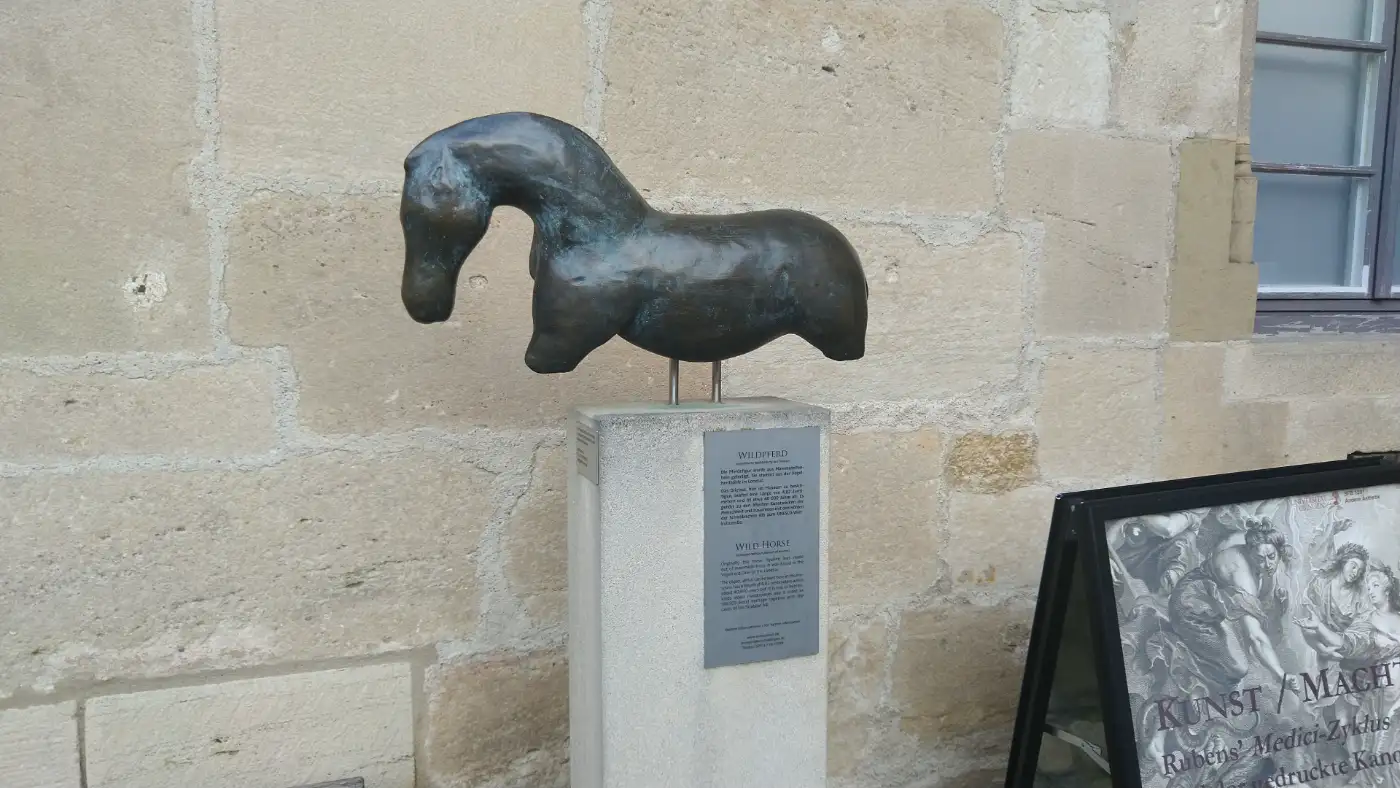 Der Anstieg endet am Schloss Hohentübingen, das hoch über der Stadt thront und auf einem steilen Bergsporn an der Spitze des Schlossbergs liegt. Die Anlage geht auf eine mittelalterliche Burg zurück, die im 16. Jahrhundert zu einem repräsentativen Renaissancebau ausgebaut wurde. Heute gehört das Schloss zur Universität Tübingen und beherbergt mehrere bedeutende Sammlungen - unter anderem archäologische, ethnologische und kulturhistorische Exponate, die weit in die Menschheitsgeschichte zurückreichen. Dadurch verbindet der Ort Geschichte, Wissenschaft und Landschaft auf besondere Weise. Wir betreten den Innenhof und genießen den weiten Blick über die Dächer Tübingens und das Neckartal, bevor wir uns wieder auf den Weg machen.Bronzeskulptur eines Wildpferds