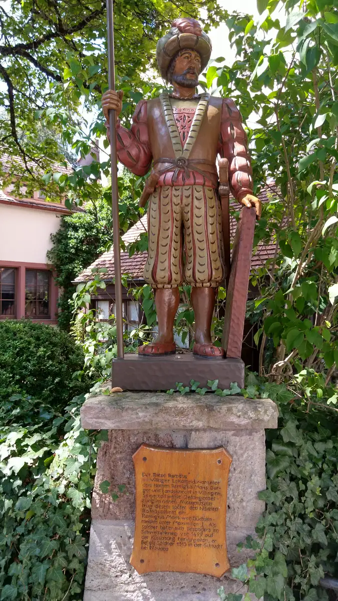 Remigius Mans, alias "Romäus" oder "Romeias", war ein Landsknecht und wird als sagenumwobener Held seiner Heimatstadt Villingen verehrt - er fiel im Jahr 1513 in der Schlacht bei Novara. Der Überlieferung zufolge war er so groß, dass er von der Straße aus in Fenster des zweiten Stockwerks sehen konnte. Berühmt ist besonders eine Geschichte, in der er sich durch eine List aus dem Michaelsturm - dem heutigen "Romäusturm" - befreien konnte, indem er auf Nagelknochen emporstieg und sich mithilfe eines selbst geflochtenen Seils aus dem Gefängnis befreite. In einem weiteren legendären Akt soll er bei einem Streit mit Rottweil die Flügel des Stadttors ausgehängt und als Trophäe nach Villingen getragen haben - was ihm den Beinamen "Villinger Simson" einbrachte. Kurz nach seinem Tod wurde ein überlebensgroßes Bildnis von ihm an der Stadtmauer angebracht - eine frühe Form des Heldendenkmals.Villinger Hochgericht