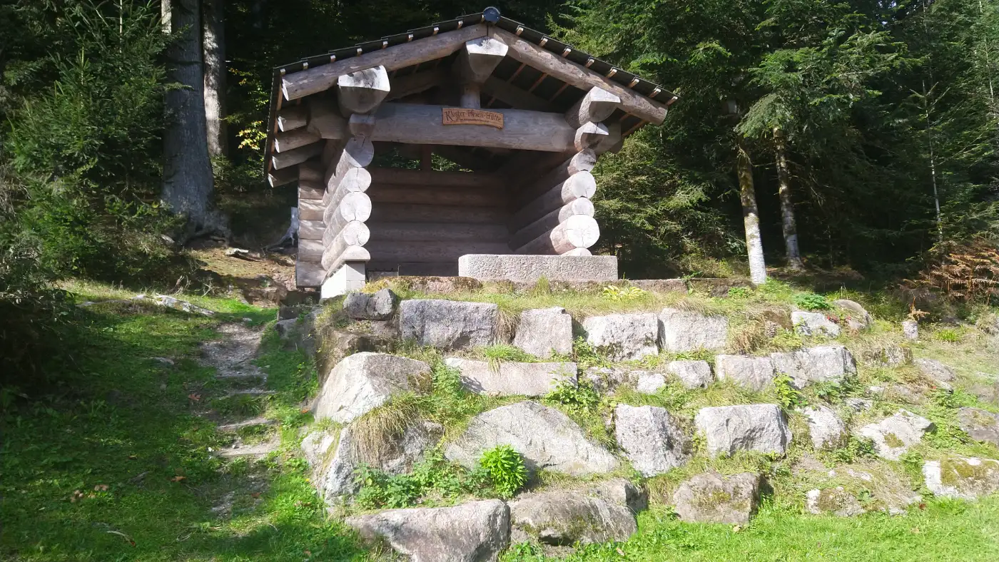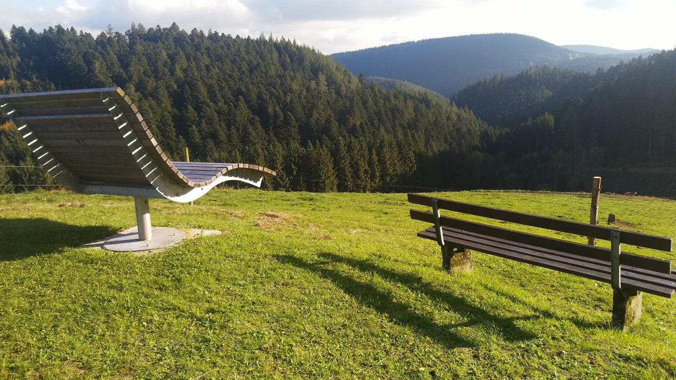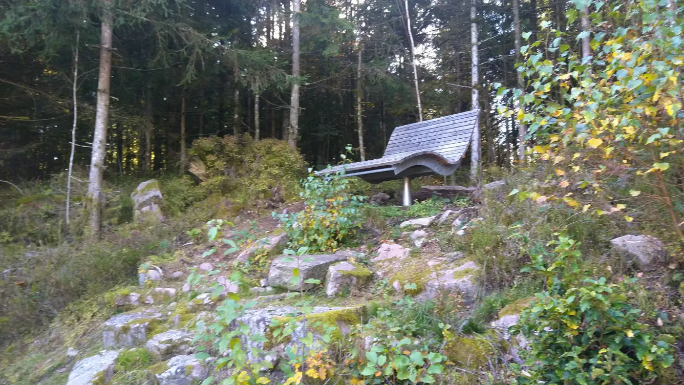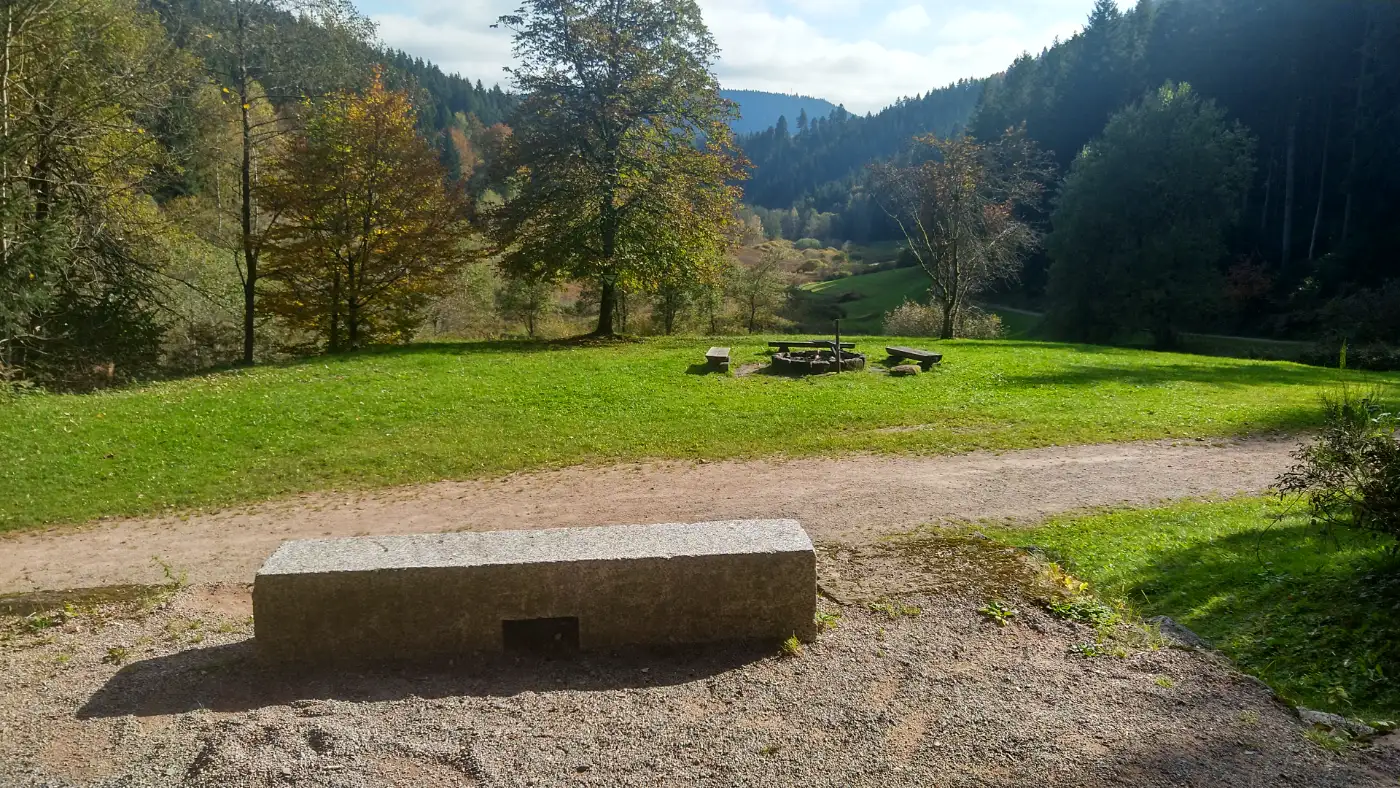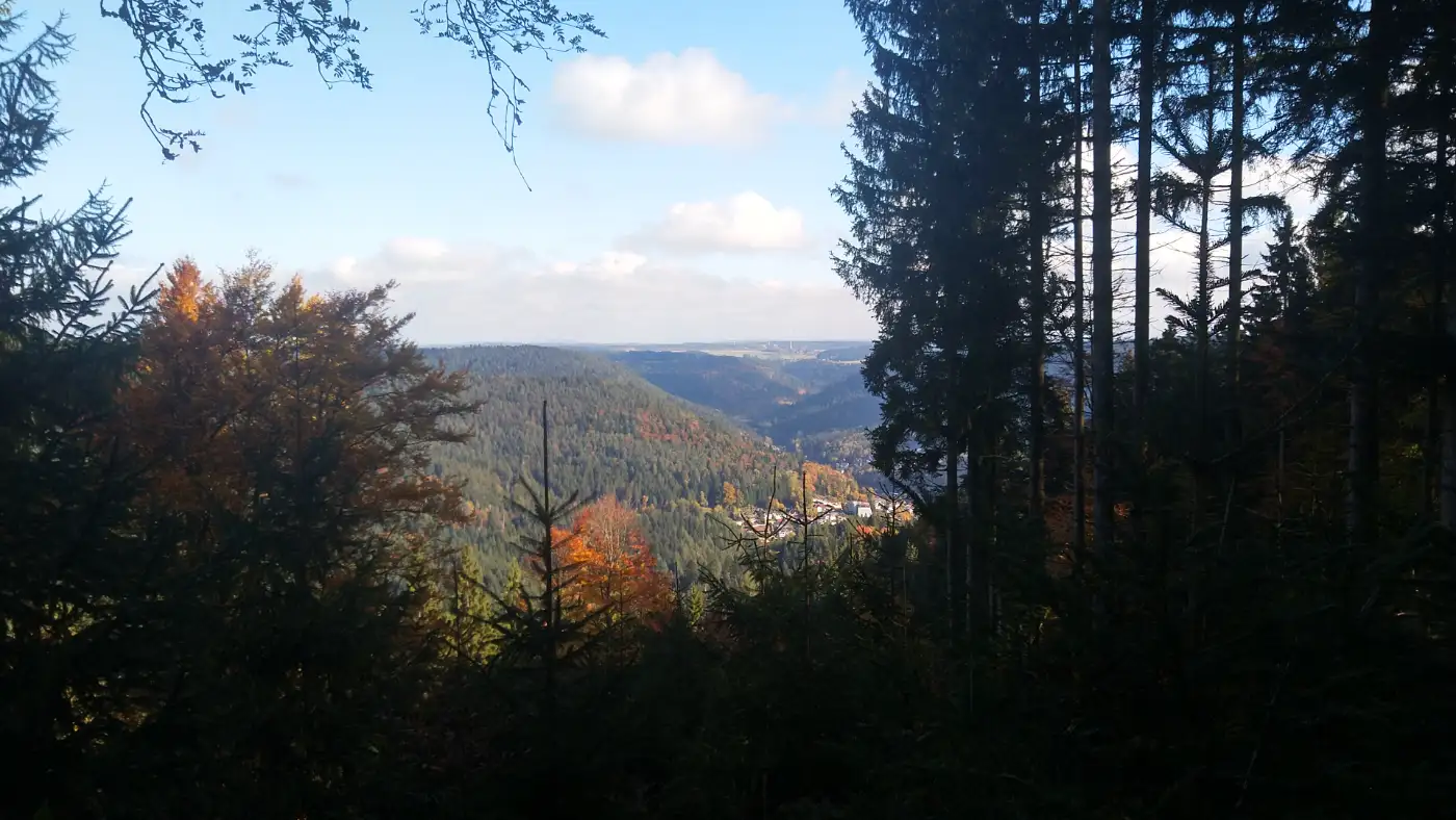 Ein kurzer Abstecher führt uns hinauf zum Staufenkopf, wo die Grillhütte zu einer wohlverdienten Rast einlädt. Von hier eröffnet sich ein weiter Panoramablick über Schenkenzell und die sanft geschwungenen Höhenzüge des Schwarzwalds. Während wir den Blick über Wälder, Täler und verstreute Höfe schweifen lassen, spüren wir die Ruhe dieses Ortes. Der Kontrast zwischen Naturerlebnis, Kulturgeschichte und stiller Weite macht den Reiz dieser Etappe besonders deutlich. Nach einer Pause treten wir den Abstieg an, folgen einem kürzeren Weg und verlassen den Premiumweg vorzeitig in Richtung Alpirsbach, um den erneuten Aufstieg zu vermeiden. So endet unsere Wanderung auf dem "Sagenhaften Alpirsbach" mit einem letzten Blick über das grüne Tal - ein stimmungsvoller Abschluss inmitten echter Schwarzwaldidylle.Diese Tour wurde am 16.10.2025 von einer realen Person erwandert, fotografiert und beschrieben. Die GPS-Daten der Fotos wurden vor Ort erfasst und dienten zur exakten Rekonstruktion der Route.