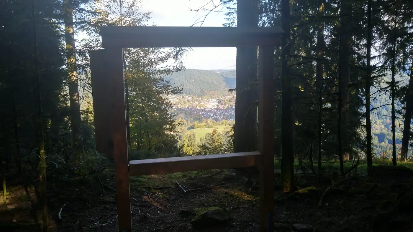 Vom Ortskern führt uns der Premiumweg "Sagenhaftes Alpirsbach" hinaus in die stille Natur. Der Rundweg beginnt offiziell am Bahnhof Alpirsbach und führt über etwa 14,7 Kilometer gleichzeitig als zertifizierter Qualitätswanderweg. Wir wandern durch lichte Wälder und offene Waldflächen, über schmale Pfade und befestigte Abschnitte, vorbei an moosbewachsenen Felsen und plätschernden Bächen - Natur, die durch den Wechsel von Schatten und Licht fasziniert. Am Wegesrand finden sich mehrere Informationstafeln, die Ausblicke, Natur- und Handwerksgeschichte von Alpirsbach erläutern. Die Mischung aus beeindruckender Naturkulisse, handwerkshistorischem Hintergrund - etwa zur Glas- und Köhlerei-Tradition - und einem gut beschilderten Wegnetz macht diesen Pfad zu einem besonderen Erlebnis, das Kopf und Herz gleichermaßen berührt.Aussicht auf Alpirsbach vom Nollenberg
