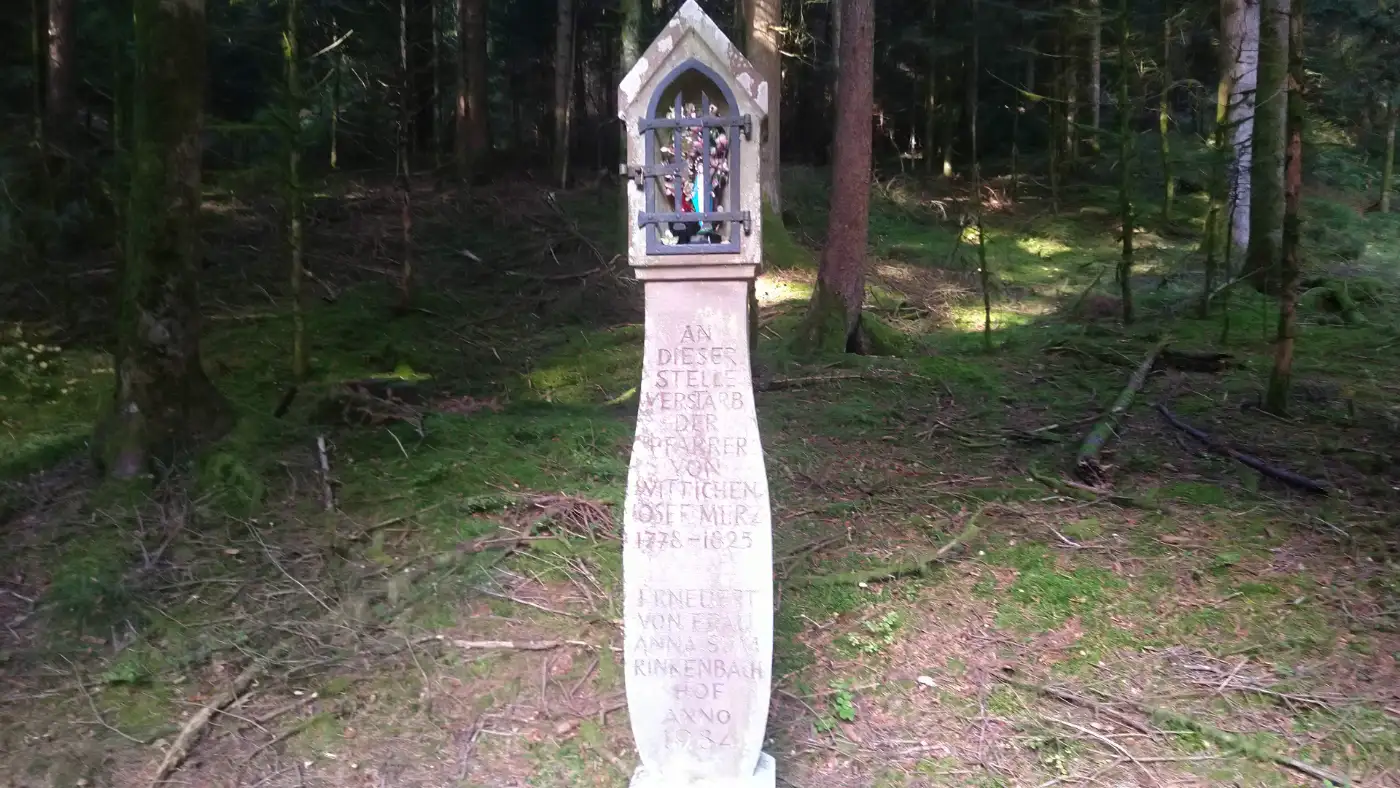 Nach einem sanften Anstieg erreichen wir den Nollenberg. Von hier öffnet sich der Blick über das Tal, und unter uns liegt Alpirsbach, eingerahmt von dunklen Wäldern und grünen Höhen. Wir verweilen einen Moment, atmen tief durch und genießen die klare Schwarzwaldluft. Die Aussicht wirkt fast wie ein Gemälde - ruhig, weit und ein wenig mystisch, ganz so, wie es zur Sagenroute passt.Grenzsteine am Reinerzauweg