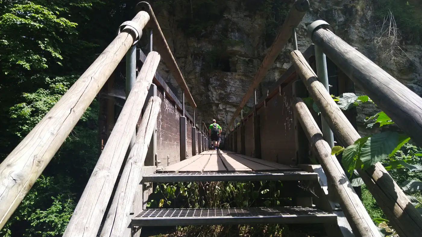 Es gibt hier gleich zwei Dreischluchtensteig- Wegweiser - einer ist für gutes, der andere für schlechtes Wetter. Wer nicht genau hinschaut, könnte leicht den falschen Weg nehmen: Der Wegweiser für schlechtes Wetter führt direkt zurück nach Bachheim, während der richtige Weg zur beeindruckenden Engeschlucht hinaufführt. Also genau auf die Beschilderung achten, um das Naturhighlight nicht zu verpassen!Die Engeschlucht