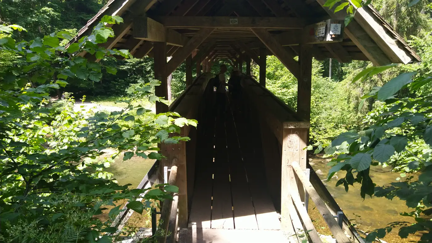 Der Bühlertalweg führt uns weiter entlang der Wutach bis zu einem besonderen Ort: Dort, wo die Gauchach in die Wutach mündet, überspannt eine charmante, überdachte Holzbrücke die Flusslandschaft. Die Überdachung hält nicht nur das Wetter fern, sondern erlaubt auch einen eindrucksvollen Blick auf die Naturkulisse. Von hier aus lässt sich das beeindruckende Zusammentreffen der beiden Gewässer hautnah erleben - das klare Wasser der Gauchach trifft auf die kraftvolle Strömung der Wutach und verschmilzt in einem dynamischen Naturschauspiel. Umgeben von steil aufragenden, bewaldeten Hängen und der wilden Schönheit der Schlucht gehört dieser Ort zweifellos zu den landschaftlichen Höhepunkten der gesamten Tour.Gaststätte Burgmühle