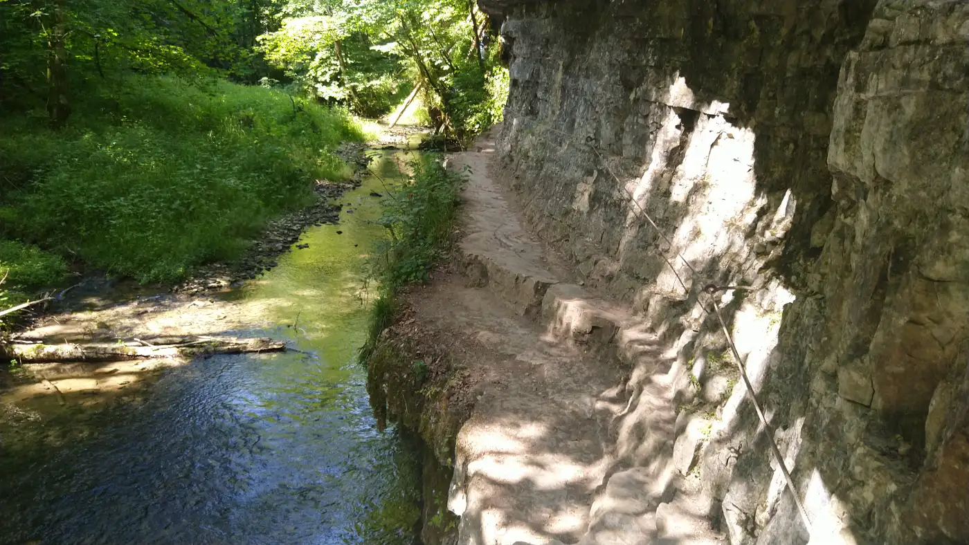 Hier beginnt der Abstieg in die Wutachschlucht. Unten angekommen folgen wir dem Wegweiser zur Gauchachschlucht und biegen links ab. Nicht mehr weit entfernt erreichen wir den Bereich, in dem die Felsenwand bis ans Ufer reicht und der Fels selbst den Weg bildet. Dieser Abschnitt, bekannt als die "Wutachflühen", ist der untere, engste und zugleich spektakulärste Teil der Wutachschlucht. Dort befindet sich auch der Wutachaustritt. Die rund 3 Kilometer lange, bis zu 85 Meter hohe Muschelkalk-Felswand bildet den eindrucksvollsten Canyonabschnitt und steht als Naturschutzgebiet unter besonderem Schutz.Der Wutachaustritt