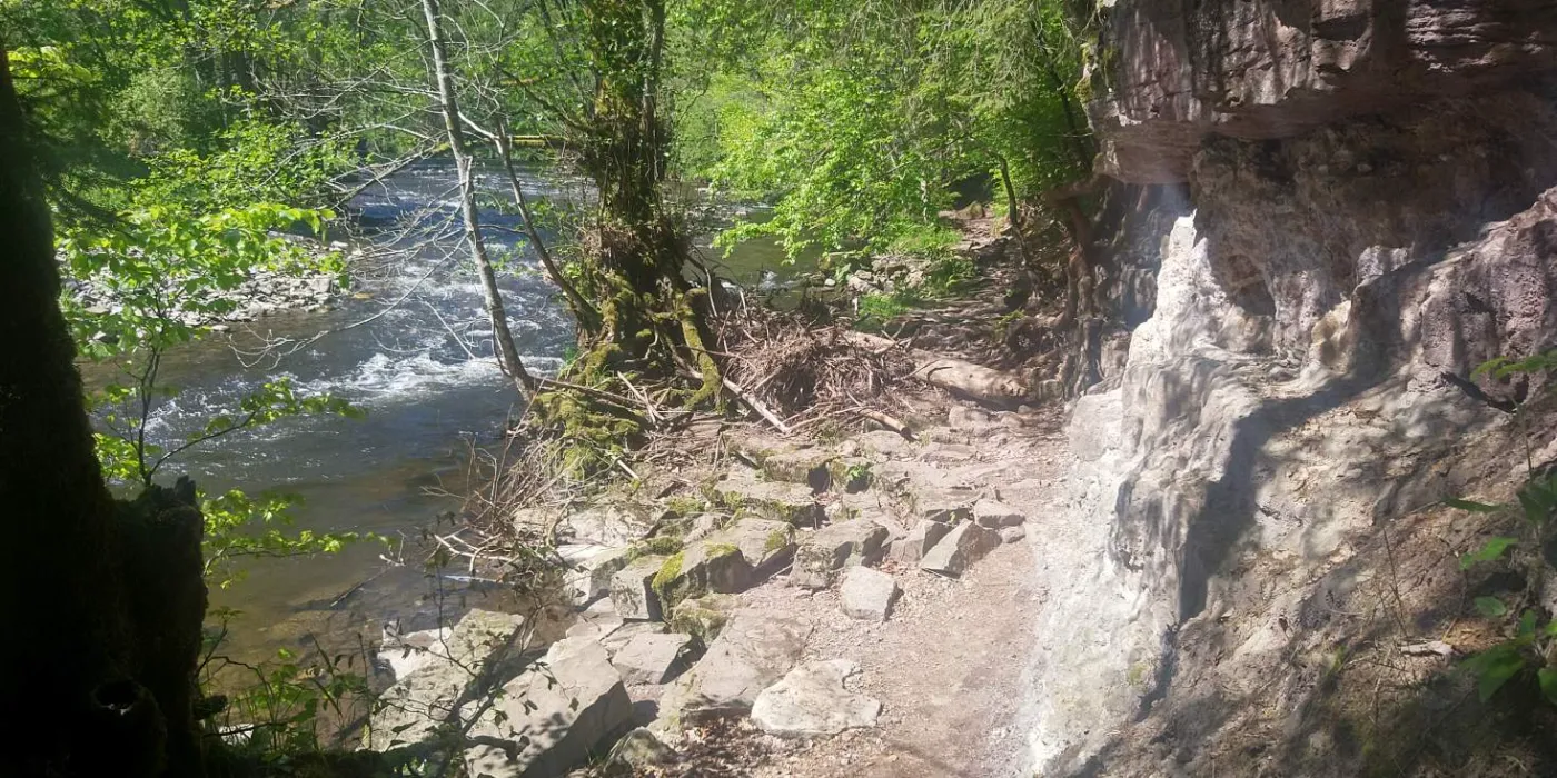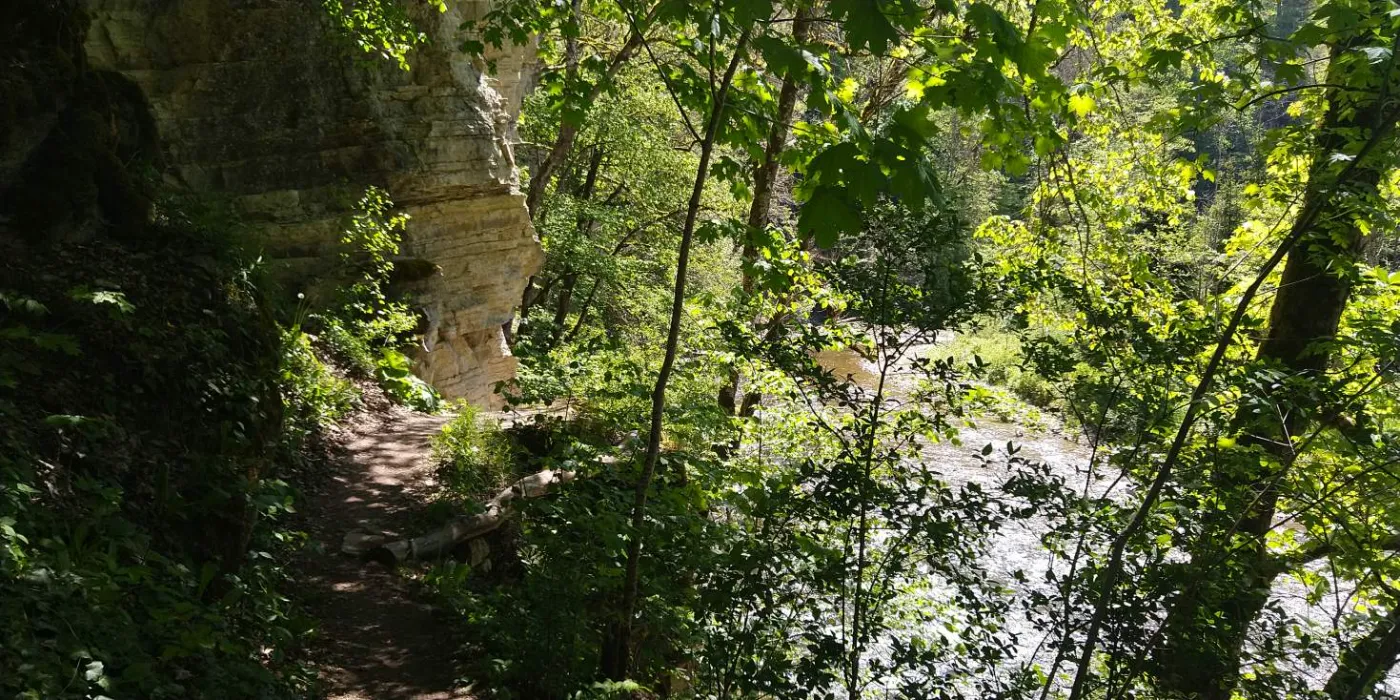 Kaum haben wir unseren Weg begonnen, tauchen wir ein in ein echtes Naturerlebnis: Der Pfad führt uns entlang einer tief eingeschnittenen Schlucht, die sich über Millionen von Jahren langsam in den Muschelkalk gegraben hat. Die Wutach, ein teils wild und ungestüm fließender Fluss, begleitet uns auf diesem Stück, wobei sie sich ihren Weg kraftvoll durch die Landschaft bahnt. Steile, bis zu 150 Meter hohe Felswände, überhängende Felsen, moosige Blockhalden, gluckernde Quellen und uralte Baumriesen säumen den Weg. Immer wieder müssen schmale Steige, kleine Holzbrücken und teils mit Drahtseilen gesicherte Abschnitte bewältigt werden - Trittsicherheit ist hier ein Muss.Rast an der Schattenmühle