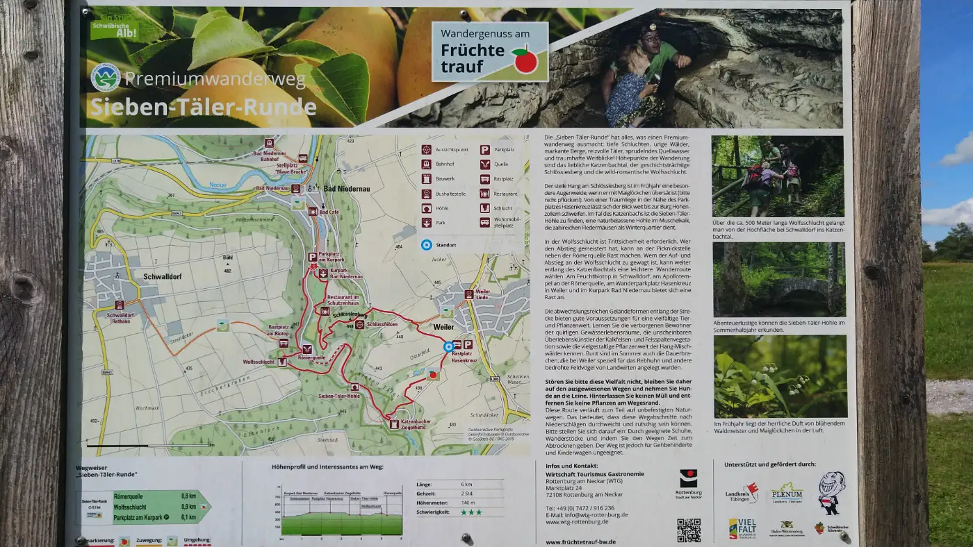 Ein faszinierendes Naturdenkmal erwartet uns mit der Sieben-Täler-Höhle, einem Muschelkalk-Gang im Katzenbachtal zwischen Weiler und Bad Niedernau. Die Höhle ist etwa 207-270 Meter lang, bei rund 6 Metern Höhenunterschied. Ihr Eingang misst weniger als einen Meter - danach betreten wir einen schmalen Gang, der stellenweise schlammig und wasserführend ist und in dem Klettern und Krabbeln nötig werden. Besonders markant: Die Höhle besitzt keine Tropfsteine und ist nicht beleuchtet. Wichtig zu wissen: Sie ist nur zwischen dem 15. April und dem 15. November geöffnet, danach bleibt das Eingangsgitter zum Schutz der Fledermäuse verschlossen; eine Taschenlampe und ein Helm gegen Steinschlag gehören unbedingt ins Gepäck.Wolfsschlucht