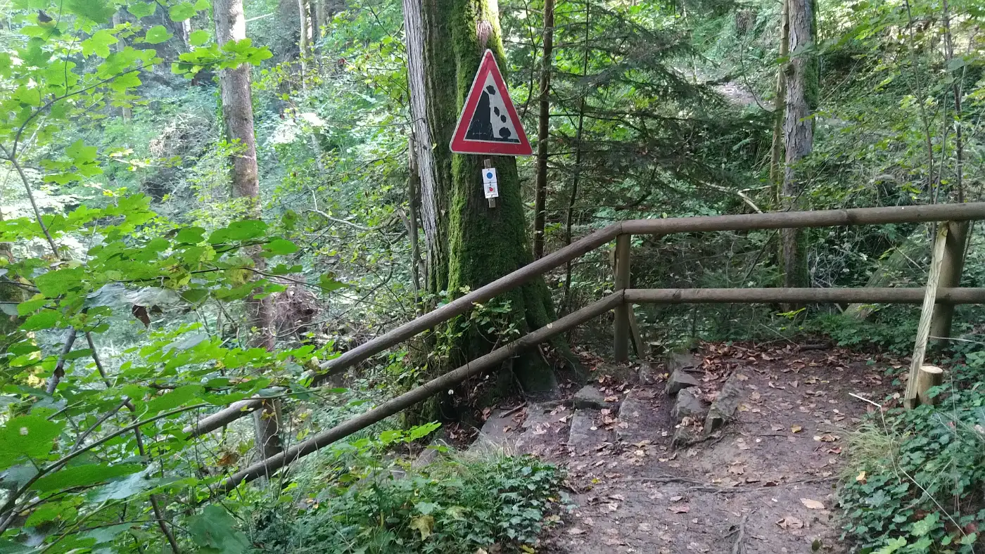 Wenig später erreichen wir die Wolfsschlucht, eine enge Passage mit steilen Felswänden und moosbewachsenen Steinen. Der Pfad schlängelt sich zwischen den Felsen hindurch, während das Spiel von Licht und Schatten der Szenerie eine geheimnisvolle Note verleiht. Wer sich für diesen Abschnitt entscheidet, sollte trittsicher sein: Der Aufstieg in die Schlucht ist steil, und beim anschließenden Abstieg kann der Weg besonders bei Nässe rutschig werden. Alternativ lässt sich die Schlucht auf einem Umgehungsweg auslassen - so bleibt die Tour für alle Wandernden gut machbar, egal ob man die Herausforderung sucht oder lieber den bequemeren Pfad wählt.Römerquelle