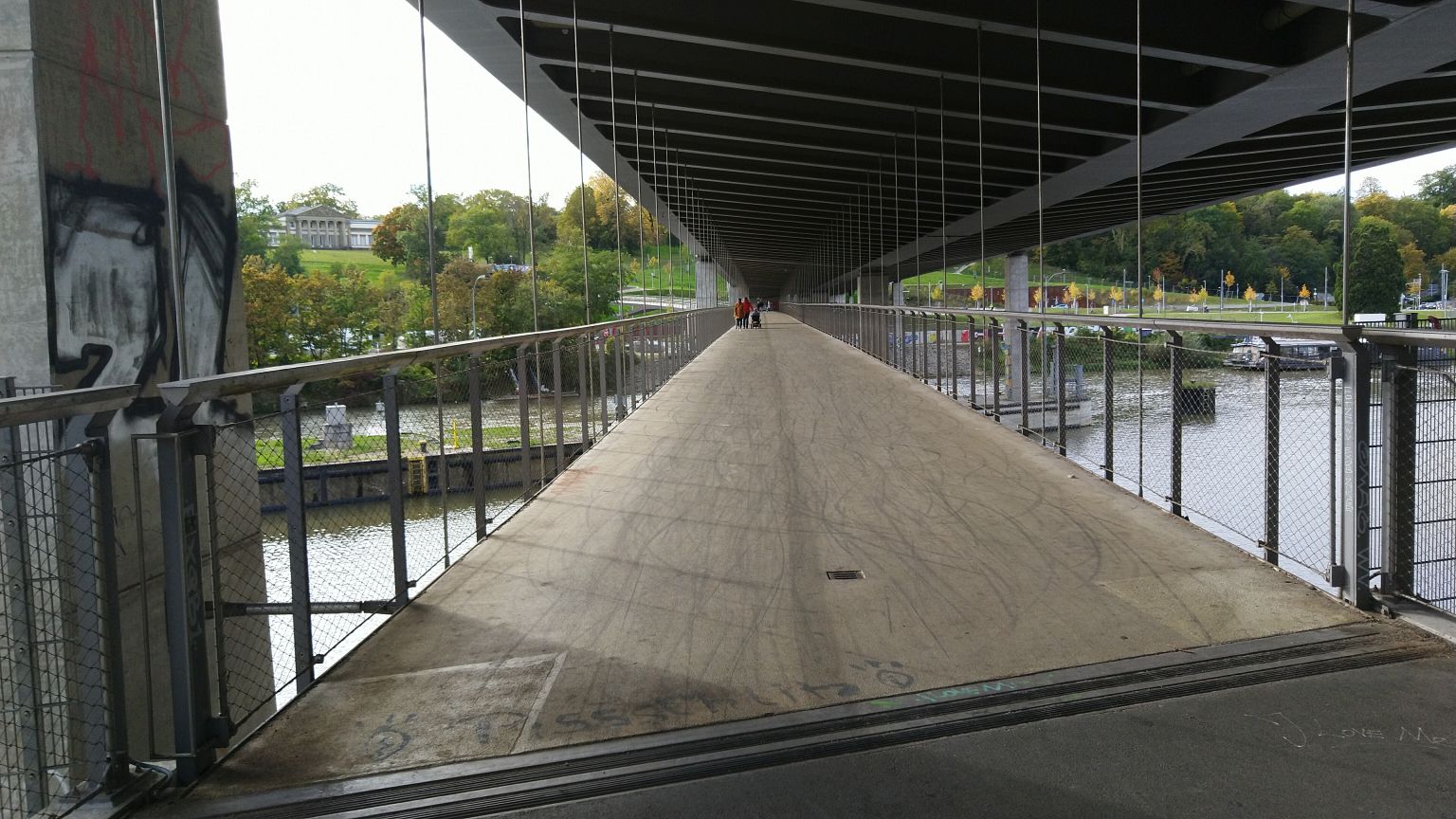 Nach einer kurzen Strecke überqueren wir den Neckarsteig, eine moderne Fußgänger- und Radbrücke, die uns sicher über den Fluss führt. Direkt dahinter erstreckt sich der weitläufige Rosensteinpark, einer der schönsten und größten englischen Landschaftsgärten Süddeutschlands. Auf unserem Weg passieren wir die imposante Nymphengruppe, eine kunstvolle Skulptur, die von Wasserfontänen umgeben ist.Unterer Schlossgarten und grüne Brücke