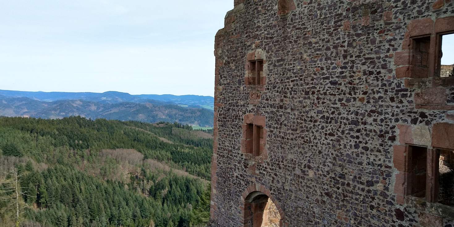 Architektonisch ist die Burg ein bemerkenswertes Beispiel für die Festungsbaukunst des Mittelalters. Die wuchtigen Mauern und charakteristischen Zwillingstürme der Burg Hohengeroldseck boten einst nicht nur Schutz, sondern prägten auch weithin sichtbar die Silhouette der Landschaft. Umgeben von einem tiefen Halsgraben und steilen Abhängen, war die Anlage strategisch perfekt positioniert - eine wehrhafte Festung, die kaum zu bezwingen war.Spektakulärer Panoramablick