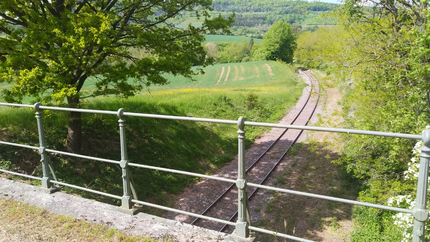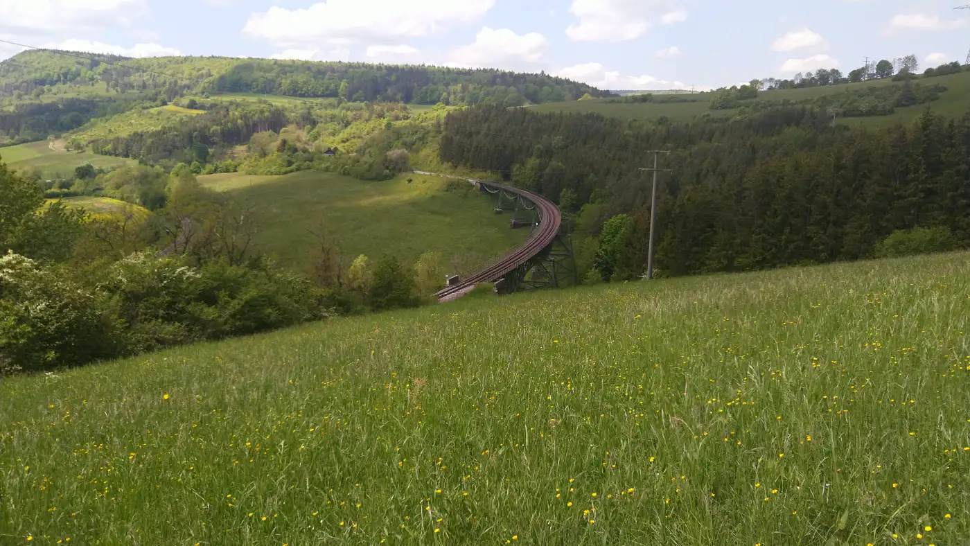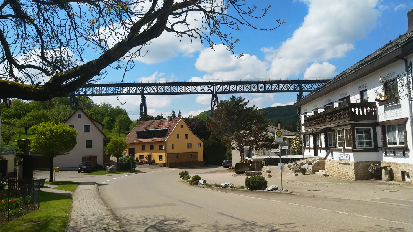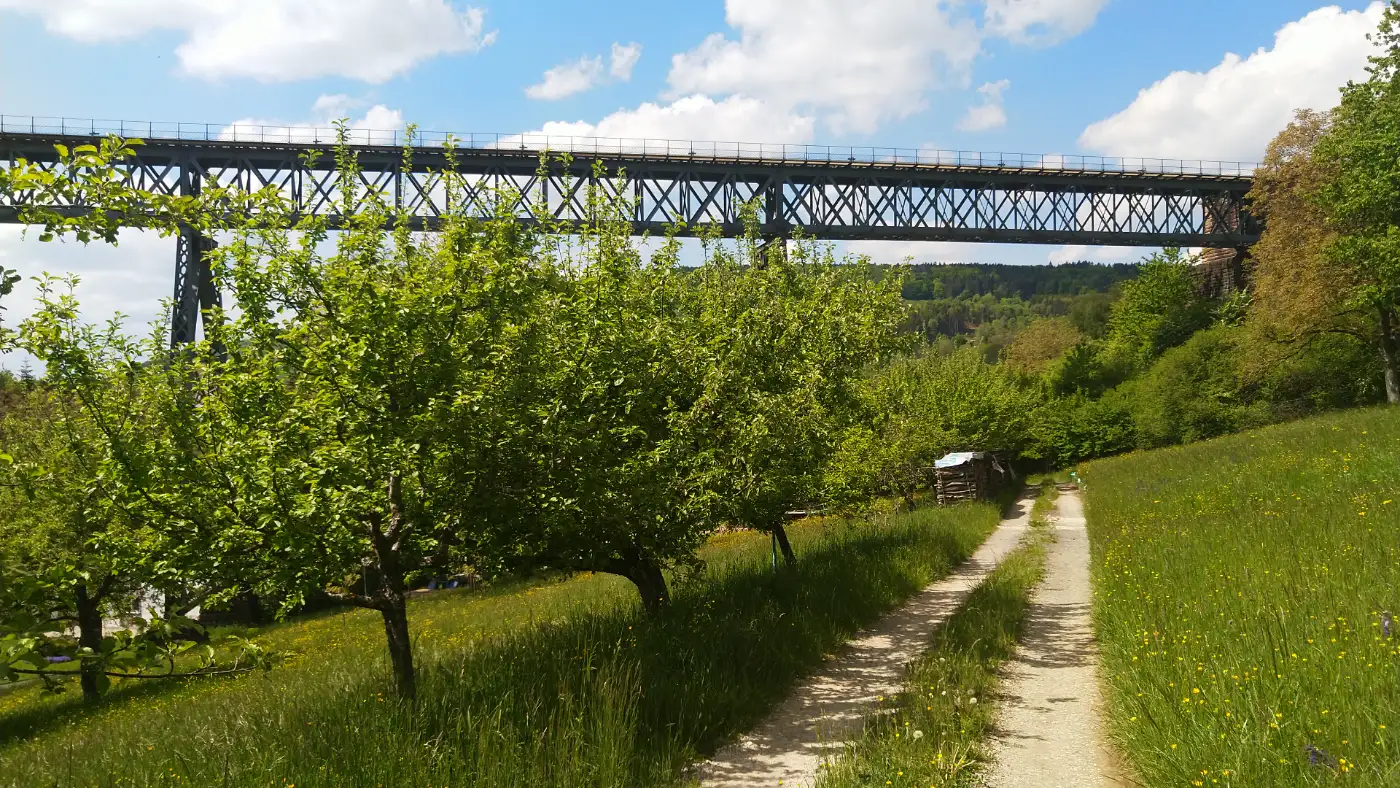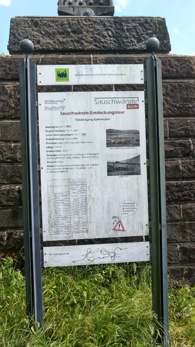 Diesmal beginnt unsere Wanderung direkt im Zentrum von Blumberg, am Edeka-Markt. Von dort folgen wir der Hauptstraße in östlicher Richtung und halten uns am Kreisverkehr leicht rechts, um den Bahnhof Blumberg-Zollhaus ins Visier zu nehmen. Am alten Bahnhof beginnt unsere Tour - dort, wo auch die berühmte Sauschwänzlebahn startet, bekannt für ihre verschlungenen Schleifen und eindrucksvollen Viadukte. Direkt dahinter geht es auf dem Wanderweg "Sauschwänzle-Entdeckungstour" los, der sich größtenteils an der Bahnlinie orientiert. Bereits nach kurzer Zeit erreichen wir den Aussichtspunkt "Vier-Bahnen-Blick", von dem aus man - mit etwas Glück - den Museumszug mehrfach auf unterschiedlichen Ebenen vorbeifahren sieht. Aus dieser Perspektive wird deutlich, wie geschickt sich die Trasse durch die hügelige Landschaft windet - fast so, als wäre sie ein natürlicher Teil davon.Vier-Bahnen-Blick und Biesenbach-Viadukt