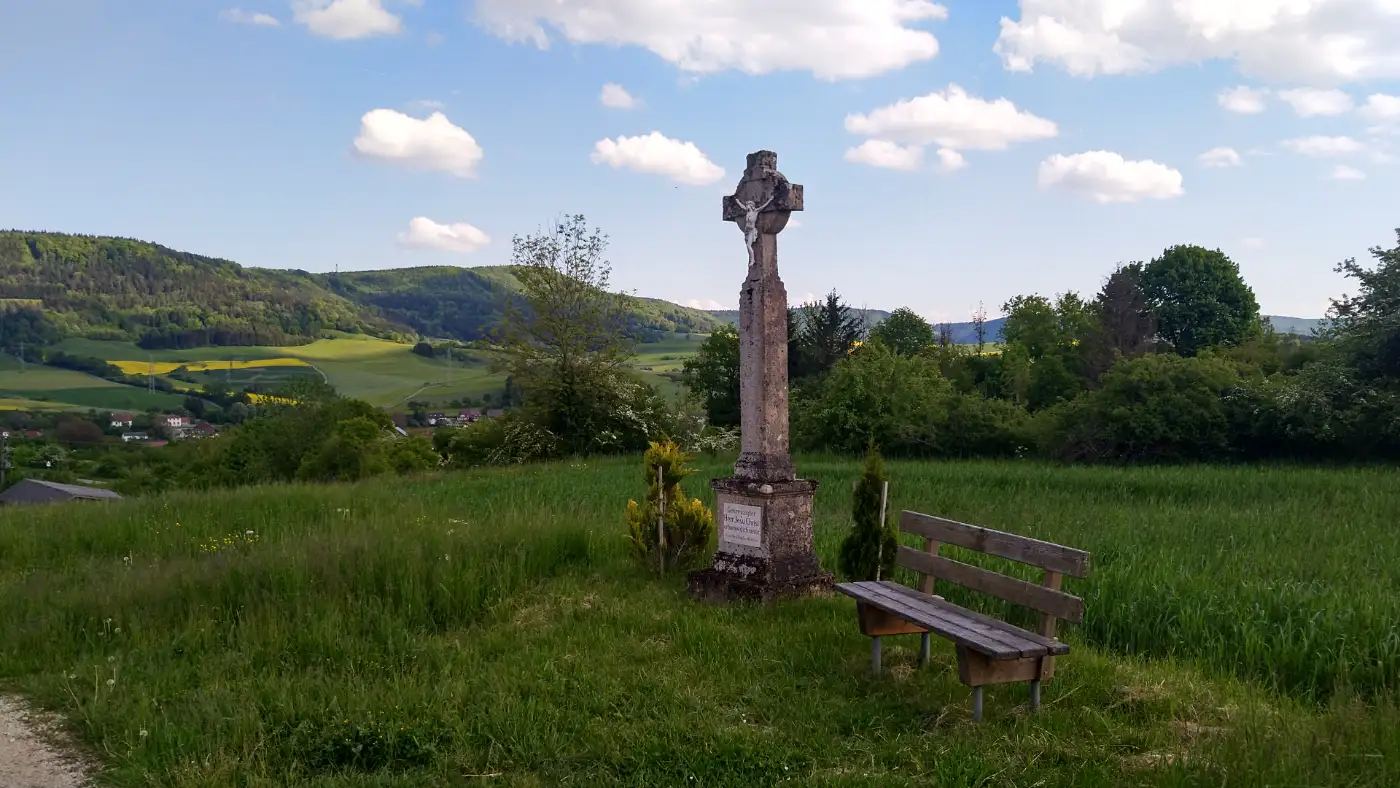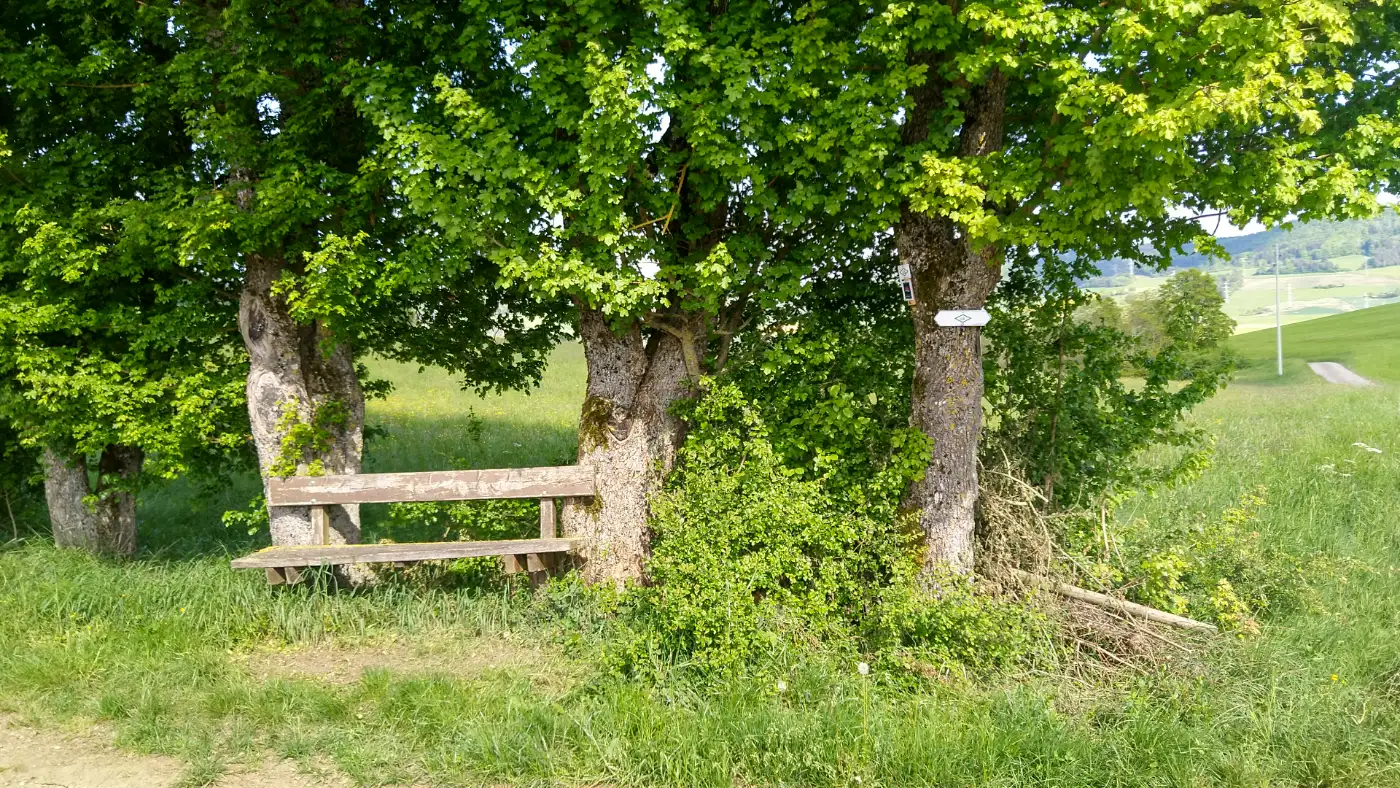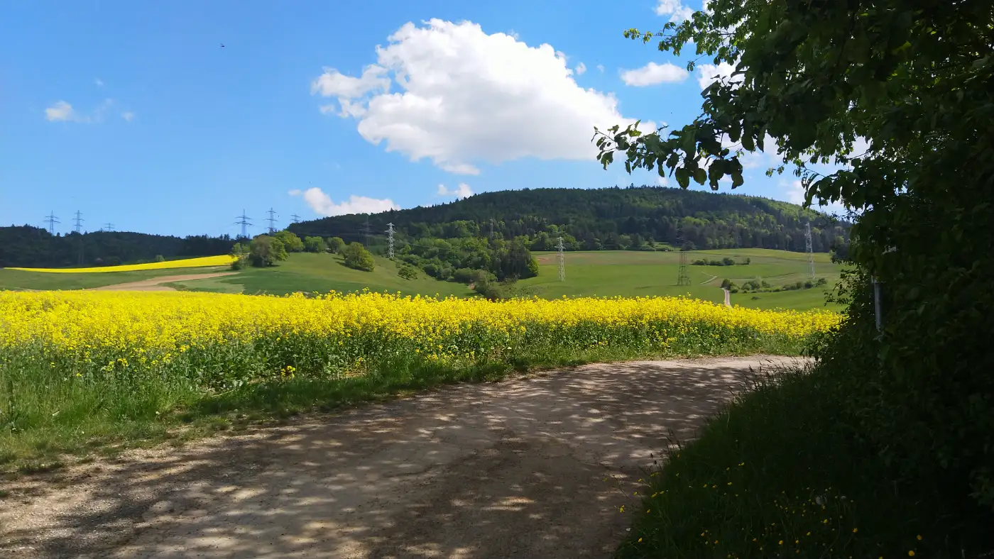 Vom Bahnhof Fützen aus geht es zunächst die Straße hinab, vorbei an der Kirche, bis wir auf die Hauptstraße treffen. Hier biegen wir links bergauf in Richtung Friedhof ab. Dort stoßen wir auf einen Abschnitt des bekannten Schluchtensteigs, dessen Wegweisern wir ab jetzt bequem folgen können. Der Aufstieg auf den Buchberg verlangt zwar etwas Kondition, belohnt uns dafür aber mit herrlichen Ausblicken auf das Randenmassiv, die Sauschwänzlebahn und bei klarer Sicht sogar bis zu den Alpen. Besonders markant am Horizont: ein scheinbar endlos dampfender Fleck, den die Einheimischen augenzwinkernd die "Wolkenfabrik" nennen. Tatsächlich handelt es sich dabei um das Kernkraftwerk Leibstadt auf der anderen Seite des Rheins, das in der Schweiz liegt und mit seiner Dampfsäule zu einem unverwechselbaren Orientierungspunkt in der Region geworden ist.