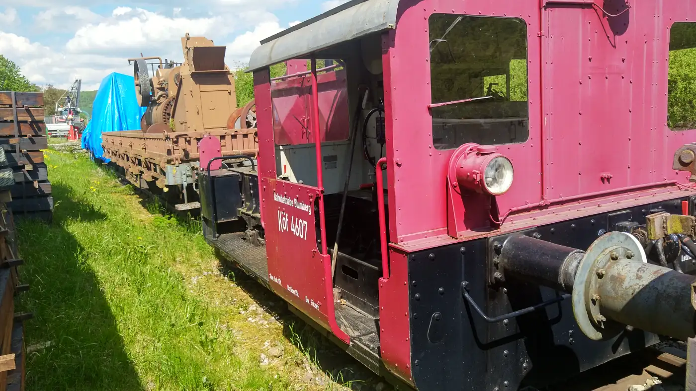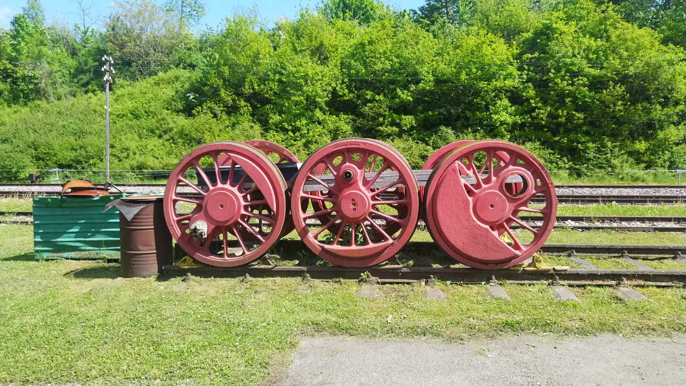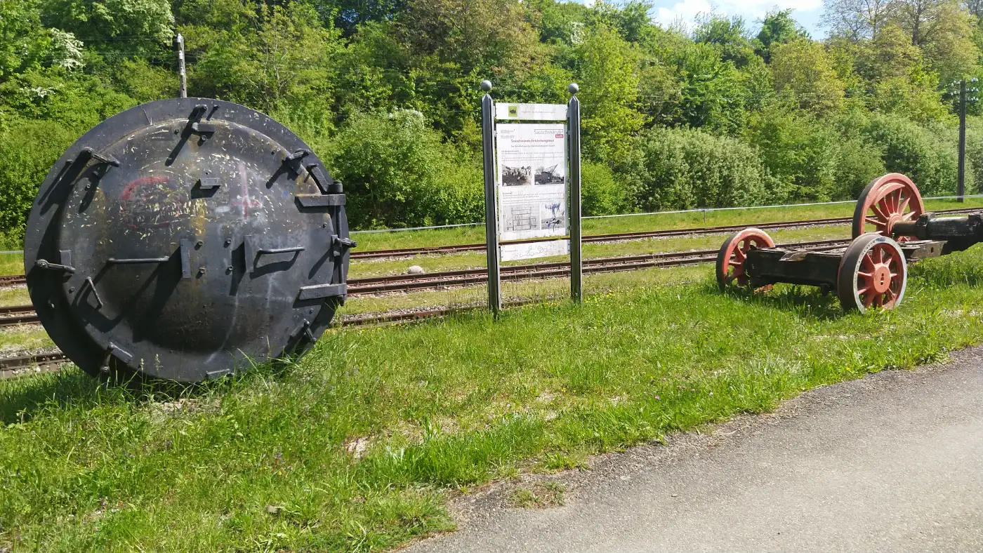 Besonders auffällig ist das Viadukt, das schnurgerade über den Ort hinwegführt - ein eindrucksvolles Beispiel für die Ingenieurskunst, mit der die Sauschwänzlebahn einst geplant wurde. Es bildet einen reizvollen Kontrast zur gewundenen Strecke weiter oberhalb und ist ein echter Blickfang auf dieser Wanderung. Wir verlassen Epfenhofen und folgen dem Wegweiser in Richtung Fützen. Der Weg führt uns idyllisch durch die sanfte Hügellandschaft - vorbei an Wiesen, Feldern und immer wieder in direkter Nähe zur eindrucksvollen Trasse der Sauschwänzlebahn. Die historische Bahnlinie ist unser ständiger Begleiter und sorgt für ein nostalgisches Flair, das die Wanderung besonders reizvoll macht.Lokschuppen in Fützen
