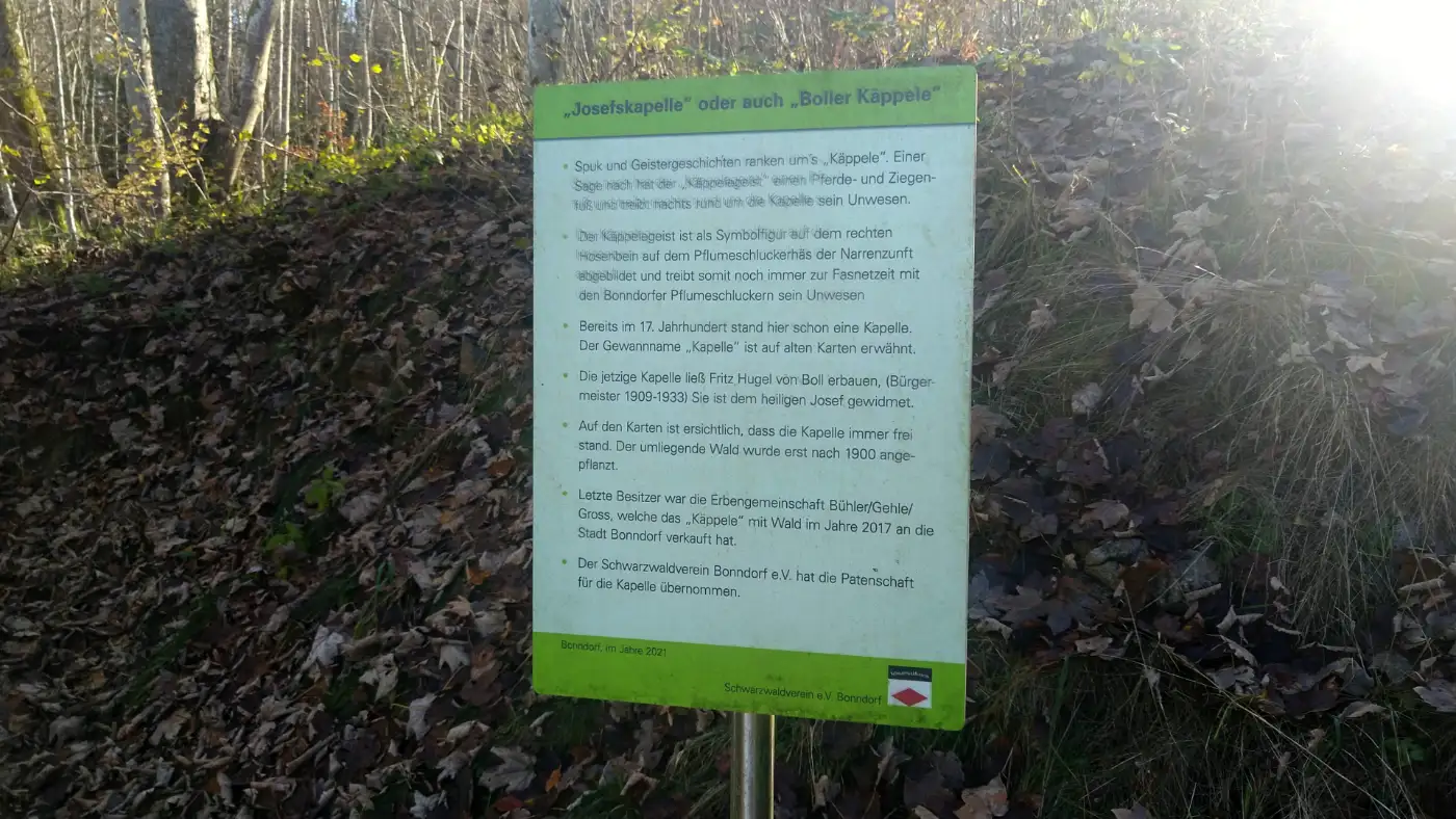 VielfĂ€ltige Wanderung durch Schluchten, WĂ€lder und Dörfer des Schwarzwalds - mit WasserfĂ€llen, alten Ruinen und eindrucksvollen Aussichtspunkten. Unsere Tour beginnt in Bonndorf am alten Bahnhof und fĂŒhrt uns zunĂ€chst hinauf zur Anhöhe "Auf der Wacht". Dort öffnet sich der Blick ĂŒber die Stadt und die Hochebene des sĂŒdlichen Schwarzwalds. Unter uns liegen die DĂ€cher von Bonndorf, wĂ€hrend sich vor uns ein harmonisches Wechselspiel aus Wiesen, WĂ€ldern und sanften HĂŒgeln erstreckt. Der Weg steigt gemĂ€chlich an, begleitet vom Duft frischer Fichten und dem Rauschen des Windes in den Baumkronen. Hier oben spĂŒren wir, wie die Hektik des Alltags zurĂŒckbleibt - ein stiller Beginn einer Wanderung, die uns Natur, Geschichte und landschaftliche Vielfalt gleichermaĂen erleben lĂ€sst.Josefskapelle bei Boll