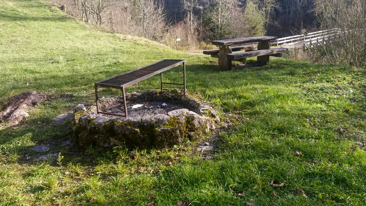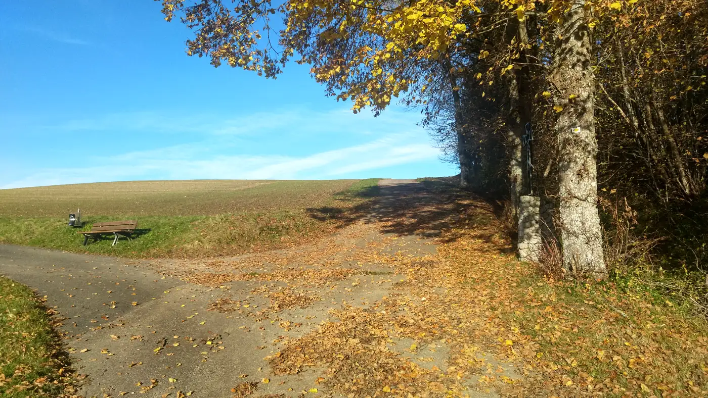 Nach einer Weile fĂŒhrt uns der Weg sanft bergab, bis zwischen den BĂ€umen die kleine Josefskapelle bei Boll sichtbar wird. Von den Einheimischen liebevoll "KĂ€ppele" genannt, ist die kleine Kapelle von alten Geschichten umgeben - man erzĂ€hlt sich, dass hier nachts ein Geist gleichen Namens spukt und in mondhellen NĂ€chten sein Unwesen treibt. Wir verweilen einen Moment, lassen den Blick ĂŒber das Dorf Boll und die weiten Wiesen schweifen und beobachten die KĂŒhe, die gemĂ€chlich auf der Weide grasen. Umgeben von mĂ€chtigen Buchen strahlt die Kapelle eine stille, fast zeitlose AtmosphĂ€re aus. Sie erinnert an die tiefe Volksfrömmigkeit vergangener Jahrhunderte - ein friedlicher Rastpunkt, bevor wir unseren Weg fortsetzen.Alter Dietfurtweg