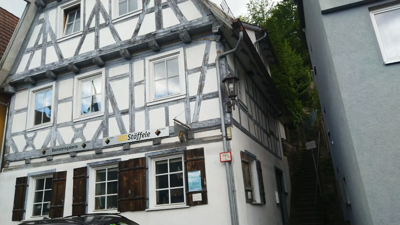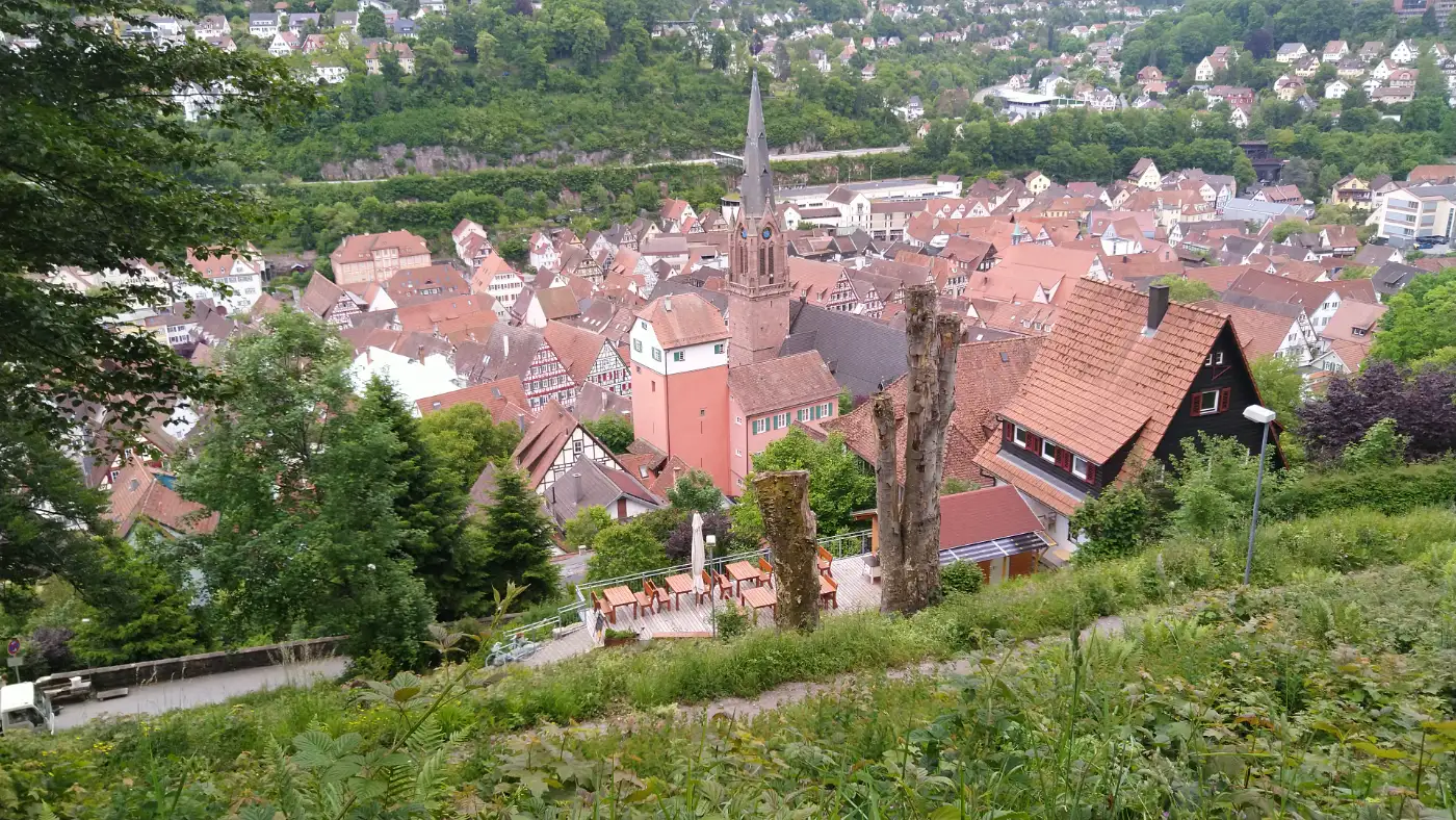 Unsere Tour startet direkt am Bahnhof Calw, der dank Aufzug auch bequem zu verlassen ist. Von hier aus schlendern wir durch die charmante Altstadt mit ihren verwinkelten Gassen, historischen Fachwerkhäusern und kleinen Geschäften. Am Kaufland biegen wir nach links ab und folgen der Haggasse stetig bergauf. Wir passieren das charmante kleine Caféhäusle und lassen nach und nach das geschäftige Stadtleben hinter uns, während wir in die beruhigende Ruhe des Waldes eintauchen. Der Anstieg ist moderat und gut zu bewältigen. Schließlich erreichen wir ein ganz besonderes Ziel: die Steinerne Bank - ein jahrhundertealtes Rastmal, das einst Kaufleuten und Wandersleuten als Ruhepunkt diente. Umgeben von Natur erzählt dieser einfache Ort viel über vergangene Zeiten.Das Calwer Schafott