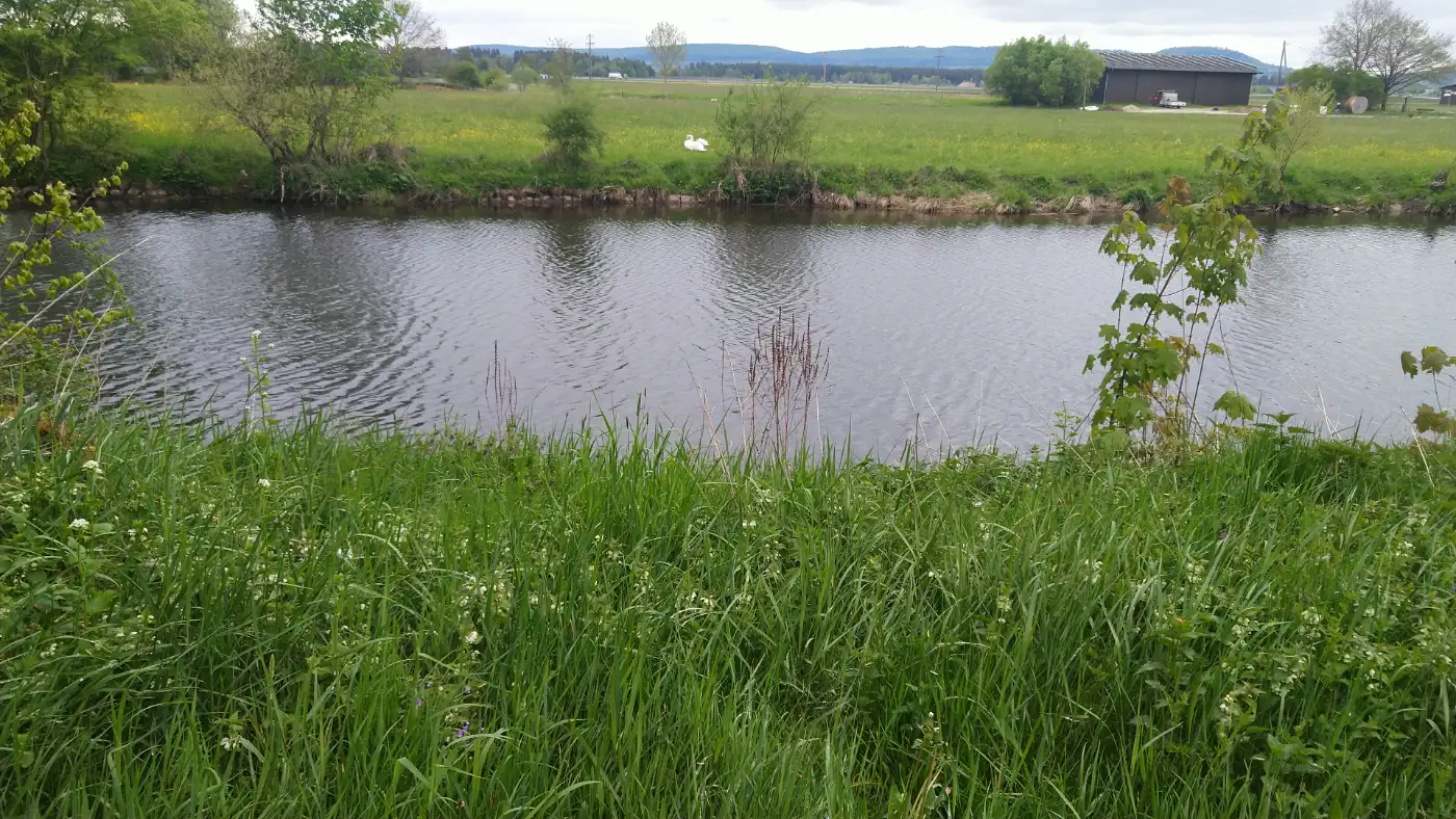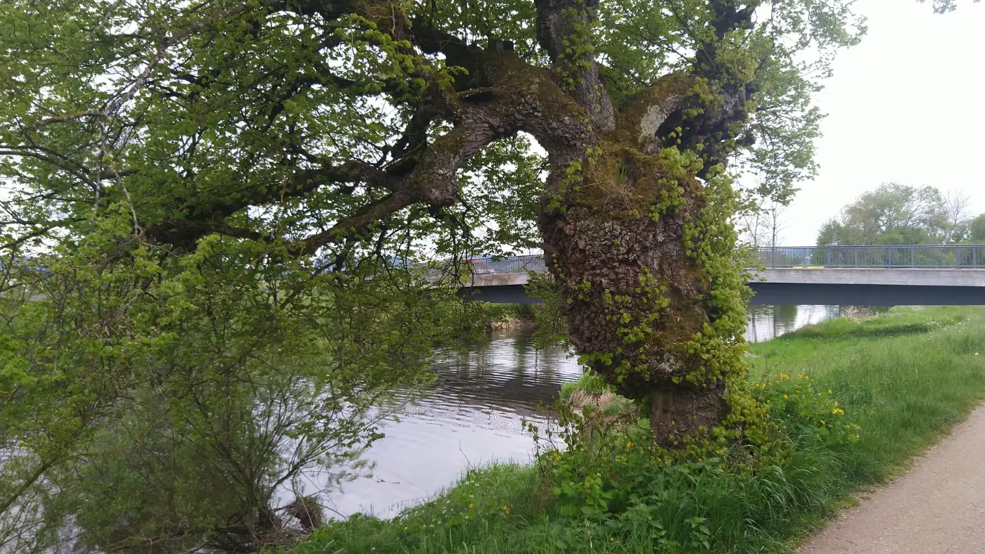 Nun geht es immer am Ufer der Breg entlang weiter in Richtung Allmendshofen, einem Ortsteil von Donaueschingen, der sich durch seine ruhige Lage und Nähe zur Natur auszeichnet. Nach einer Weile erreichen wir die Rückseite des großen Bauhaus-Gebäudes, wo wir rechts abbiegen und Kurs auf Hüfingen nehmen.Hüfingen