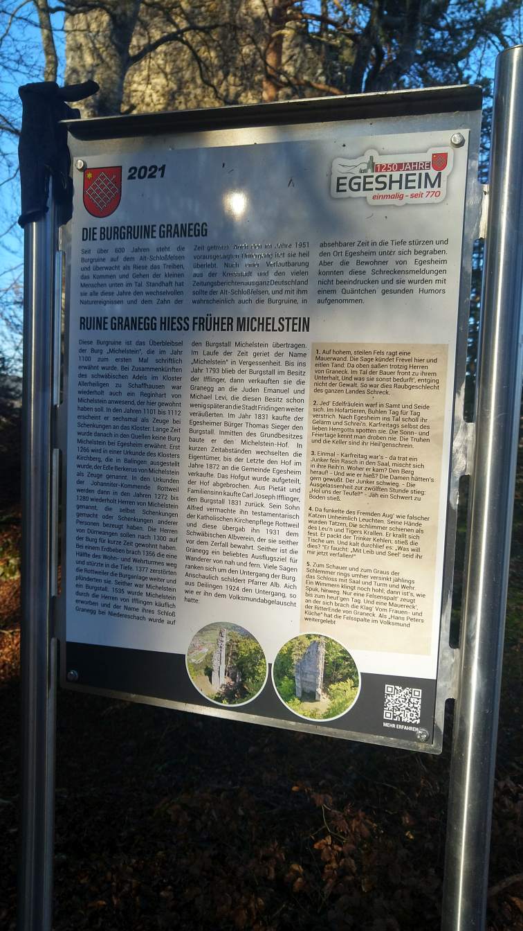 Unsere Wanderung beginnt am Rathaus in Egesheim, einem charmanten Dorf am Rand der Schwäbischen Alb. Vor der Kirche biegen wir rechts ab und wandern am Friedhof vorbei. Ein schmaler Wiesenpfad führt uns hinauf in den Wald, wo es erneut rechts bergan geht. Schon bald erreichen wir den Schlossfelsen, auf dem sich die eindrucksvolle Ruine Granegg erhebt.Burg Granegg