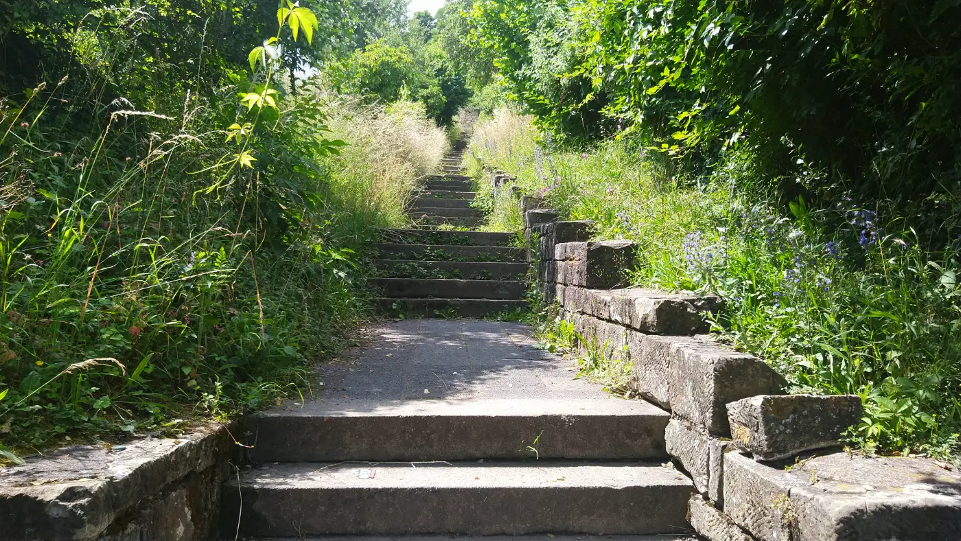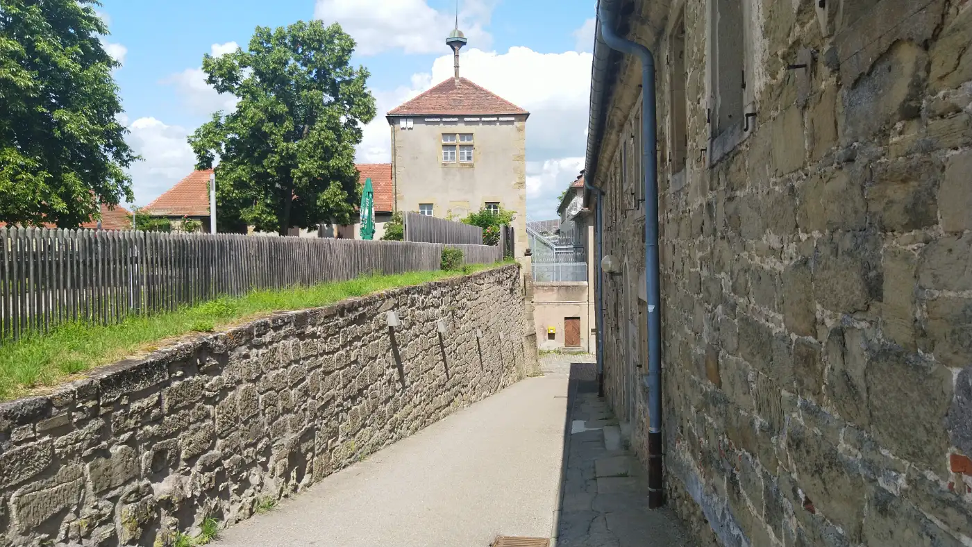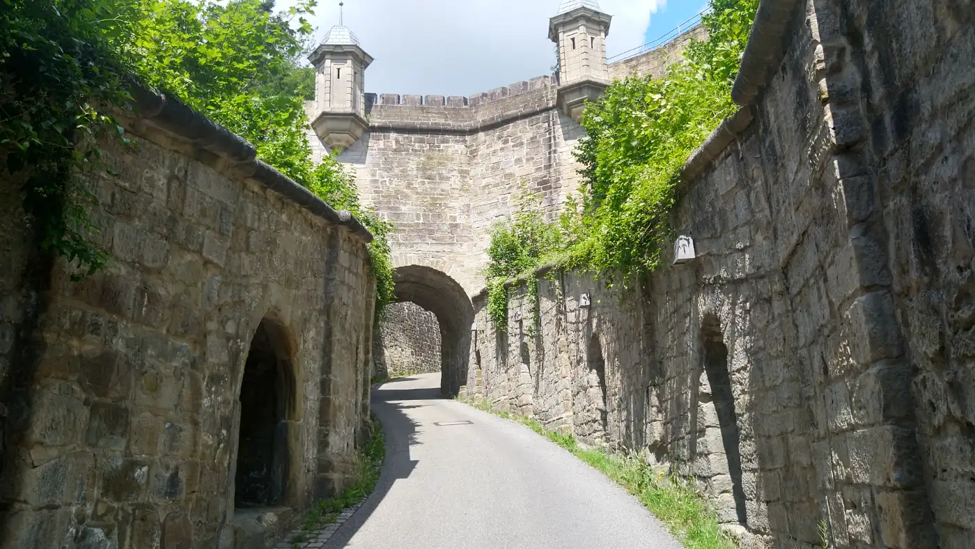 Über die steile Treppe Schwitzgässle gelangen wir hinauf zum Festungsgraben und erreichen den runden Festungsturm an der sogenannten Hügelsburg, einem markanten Teil der historischen Anlage. Der Weg führt uns nun direkt neben dem Graben entlang, stets mit freiem Blick auf die Stadt Asperg zur Linken und der mächtigen Festungsmauer zur Rechten. Bald schon fällt unser Blick auf den Stacheldraht, der die Mauer krönt - ein unübersehbares Zeichen dafür, dass sich dahinter heute das Justizvollzugskrankenhaus Hohenasperg befindet. Dieses nutzt einen Teil der Festung noch immer als Gefängnis, was der geschichtsträchtigen Anlage eine besondere, bis heute spürbare Bedeutung verleiht.Die Festung Hohenasperg