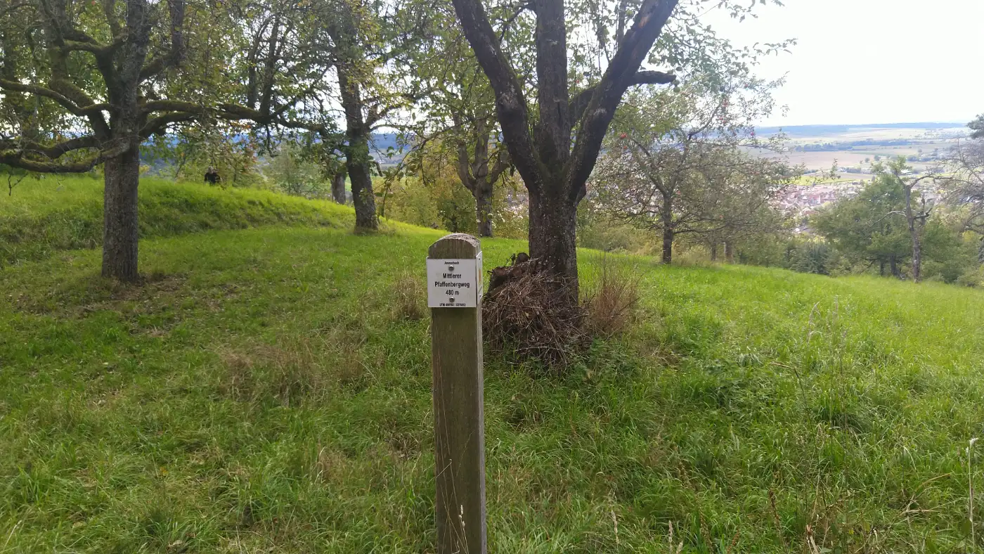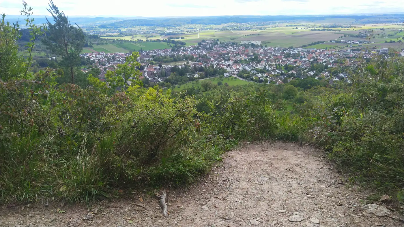 Wir erkunden historische Orte, entdecken uralte Kleindenkmale und verbinden Naturerlebnisse mit interessanten Sehenswürdigkeiten entlang des Weges. Wir beginnen unsere Tour am Bahnhof Entringen und folgen dem Weg zunächst zur Lutz-Ackermann-Pyramide neben der Volksbank. Von dort geht es weiter zur evangelischen Pfarrkirche St. Michael. Der wuchtige Bau mit seinem markanten Turm strahlt Geschichte aus, während die Sonnenuhr an der Fassade uns schon am frühen Morgen den Takt vorgibt. Der Kirchplatz selbst vermittelt Ruhe und lädt dazu ein, kurz innezuhalten, bevor wir uns auf den Weg ins Grüne machen.Aussicht auf Entringen vom Pfaffenberg