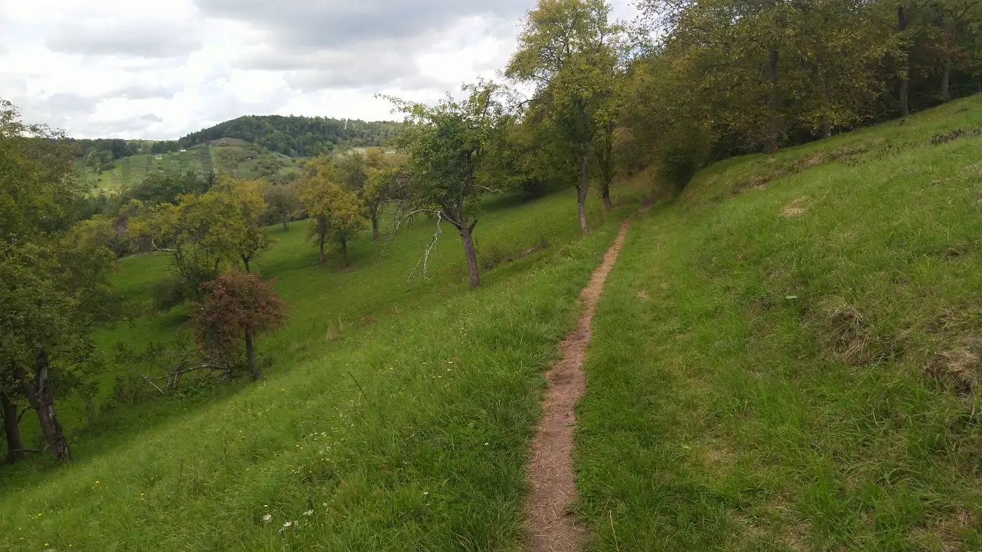 Kurz darauf erreichen wir einen idyllischen Aussichtspunkt. Zwei Bänke laden hier zum Rasten ein, während wir die freie Sicht auf die Ausläufer des Schönbuchs genießen. Von hier schweift unser Blick weit über Teile der Schwäbischen Alb, wo die Burg Hohenzollern markant auf ihrem Berg thront und die Wurmlinger Kapelle wie ein weißes Wahrzeichen über den Feldern steht. Die Ruhe an diesem Ort, nur durch Vogelrufe und das Rascheln der Bäume begleitet, macht ihn zu einem echten Höhepunkt unserer Wanderung.Weinberge im Hintergrund Entringen