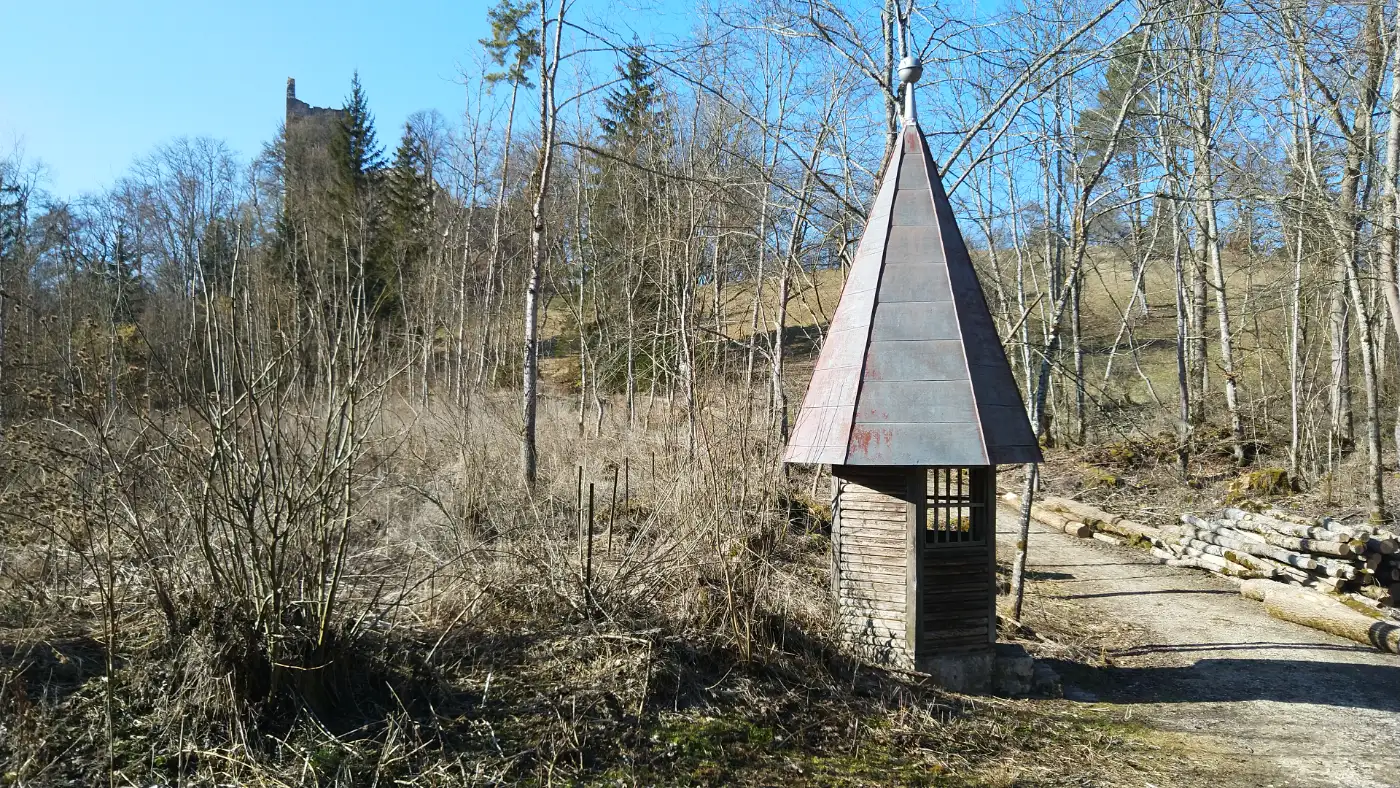 Von hier aus sind es nur noch wenige Minuten, bis wir unser Ziel erblicken: die Ruine Kallenberg. Kurz vor dem finalen Aufstieg passieren wir die Gedächtniskapelle, die in Erinnerung an die früheren Bewohner und Verteidiger der Burg errichtet wurde.Aufstieg zur Burg Kallenberg