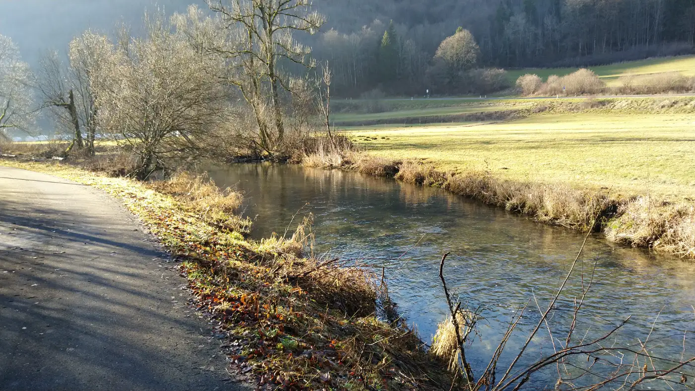 Abenteuerliche Wanderung durch enge Schluchten, Höhlen und steile Pfade entlang eines klaren Flusses mit Burgruine, Felsbögen und Andachtsorten. Wir starten unsere Wanderung am Bahnhof von Fridingen und laufen nach etwa 500 Metern am weitlĂ€ufigen Industrieareal der Hammerschmiede Fridingen GmbH vorbei. Schon von auĂen ist zu hören, dass hier intensiv gearbeitet wird: Das rhythmische Schlagen der Maschinen gehört zur Schmiedetradition dieses Ortes und verleiht dem Auftakt unserer Tour eine ungewohnt kraftvolle Klangkulisse. Das Unternehmen fertigt mit der Wasserkraft der BĂ€ra hochwertige GesenkschmiedestĂŒcke und WarmflieĂpressteile, die weltweit in Fahrzeugen, Maschinen und anderen technischen Anwendungen eingesetzt werden.Das BĂ€ratal