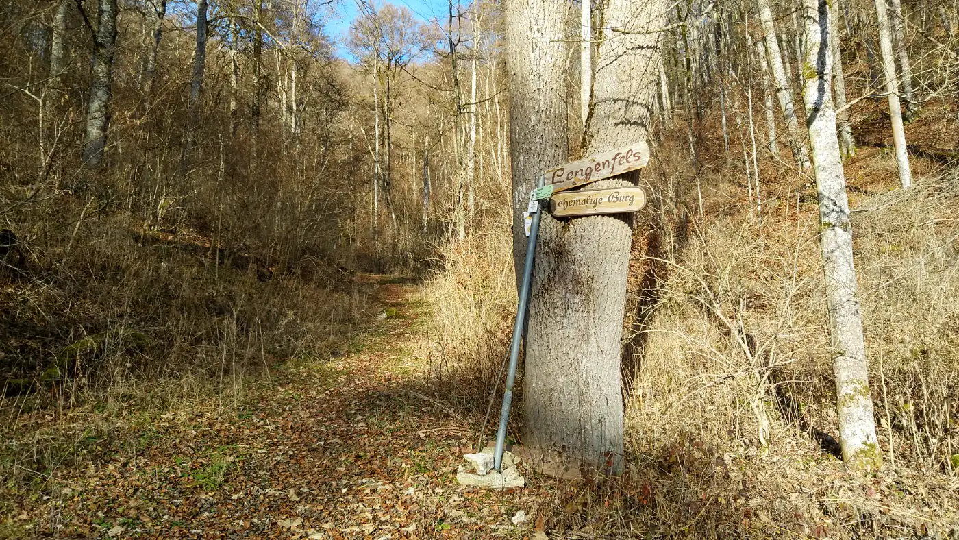 Unser Weg fĂŒhrt weiter flussaufwĂ€rts durch das charakteristische BĂ€ratal hinauf. Die BĂ€ra, nach der das Tal benannt ist, entsteht aus dem Zusammenfluss von Oberer und Unterer BĂ€ra im Hochplateau der SchwĂ€bischen Alb und flieĂt insgesamt rund 26 Kilometer, bevor sie bei Fridingen in die Donau mĂŒndet. Immer wieder öffnen sich kleine Lichtungen, von denen aus wir den Blick ĂŒber das von Kalkfels geprĂ€gte Tal schweifen lassen. Die abwechslungsreiche Geologie und die geschĂŒtzte Flora des BĂ€ratals machen diesen Abschnitt zu einem besonders lohnenden Naturerlebnis auf unserer Wanderung.Aufstieg zur Burgruine Lengenfels