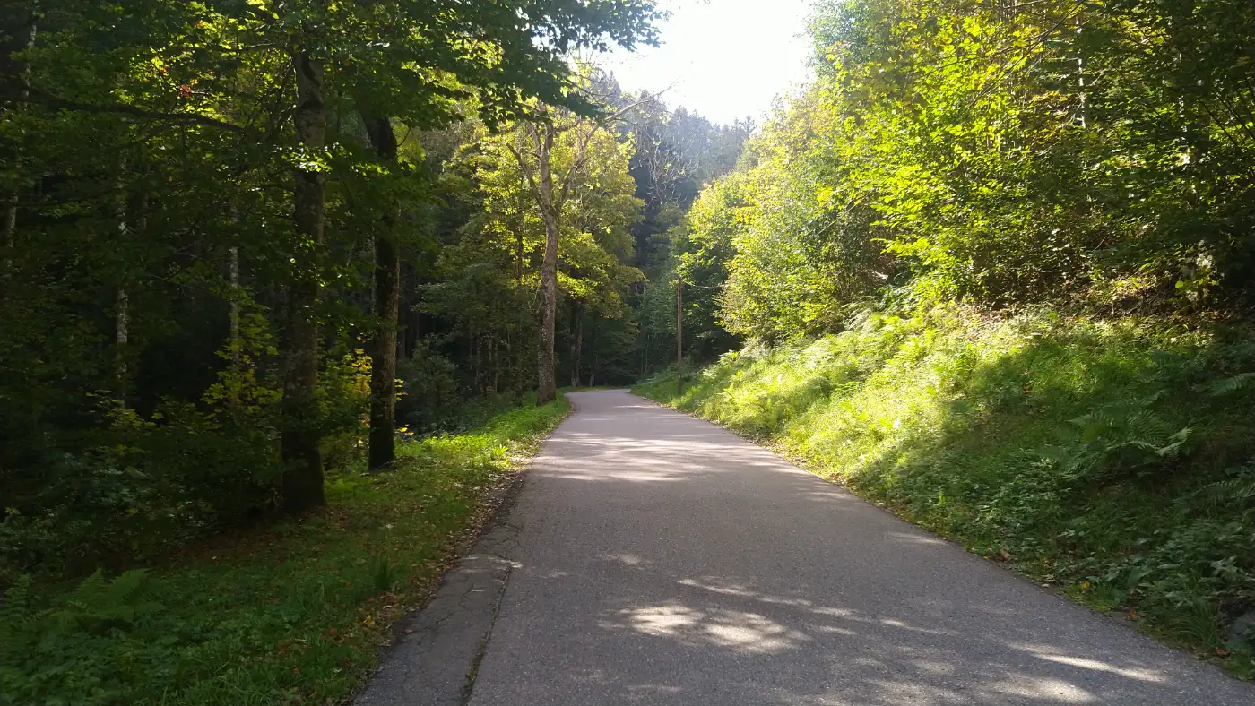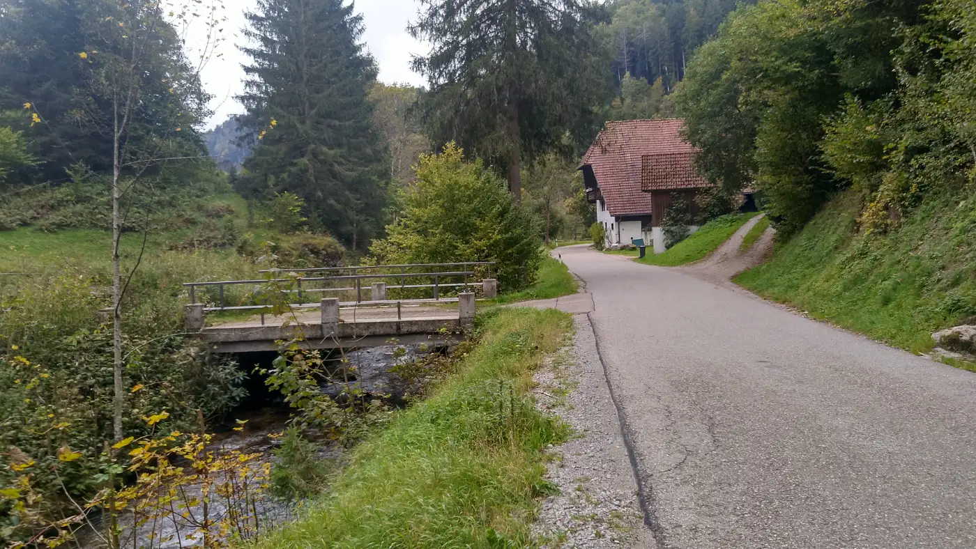 Hinter Neukirch führt unser Pfad durch ein stilles Waldtal, dem Heubach folgend, hinunter ins Hexenloch. Entlang der Landstraße entdecken wir mehrere alte Schwarzwaldhöfe, deren Schindeldächer sich harmonisch in die Landschaft einfügen. Diese Höfe wirken fast wie aus der Zeit gefallen - ein Sinnbild für das einfache, traditionsverbundene Leben, das den Schwarzwald prägt. Hier hört man nur das Rauschen des Heubachs. Für etwa eineinhalb Kilometer müssen wir der Landstraße Hexenloch folgen, die für den Straßenverkehr freigegeben ist. Besonders an Wochenenden ist sie bei Motorradfahrern sehr beliebt, was den Wegabschnitt laut und unruhig machen kann. Trotz des Verkehrs bleibt die umgebende Landschaft atemberaubend, sodass die Szenerie zwischen Fichten, Heubach und Schwarzwaldhöfen beeindruckend bleibt, auch wenn wir den Straßenlärm in Kauf nehmen müssen.Hexenlochmühle