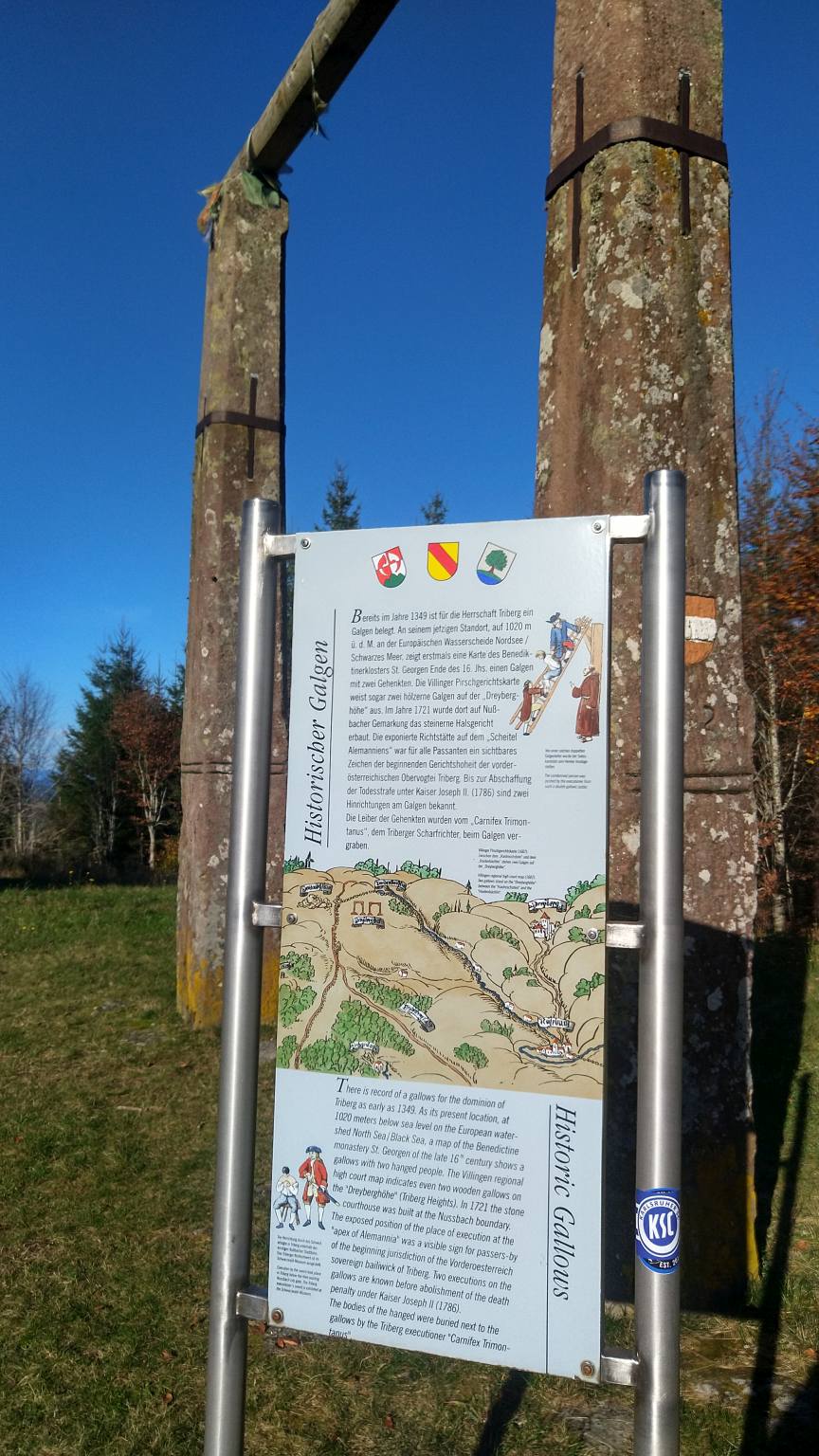 Der Galgen lässt sich bis ins 14. Jahrhundert zurückverfolgen und war noch bis weit ins 18. Jahrhundert hinein in Gebrauch. Eine der frühesten bildlichen Darstellungen findet sich auf einer Karte des Benediktinerklosters St. Georgen aus dem 16. Jahrhundert: Dort ist der Galgen deutlich eingezeichnet - sogar mit zwei Figuren, die vom Querbalken hängen. Ursprünglich bestand die Anlage aus einem schweren hölzernen Balken, der von zwei massiven Sandsteinsäulen getragen wurde, die bis heute erhalten geblieben sind. Mit eisernen Bändern verstärkt, zeugen die Pfeiler von der beabsichtigten Dauerhaftigkeit und der symbolischen Schwere dieses Ortes.Lage des Galgens