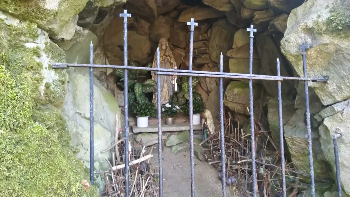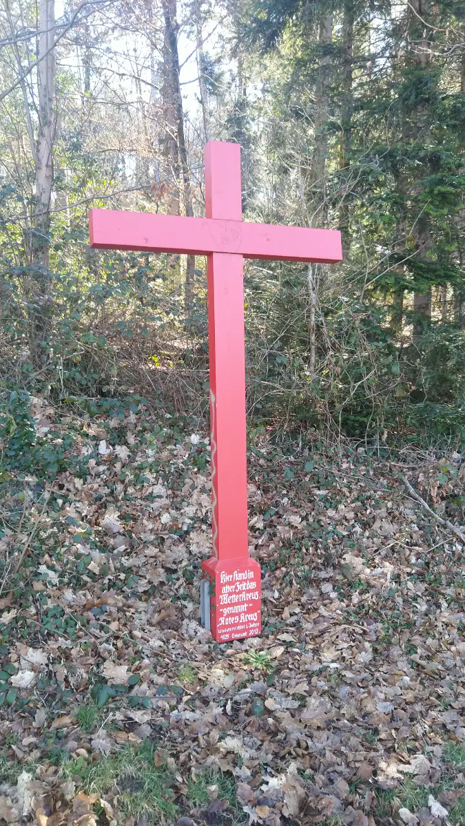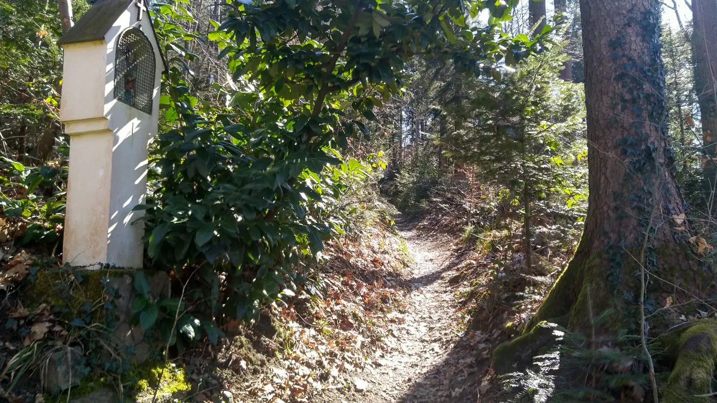 Der Kreuzweg, gesäumt von beeindruckenden Stationen, begleitet uns auf unserem Weg zum Urenkopf. Unterwegs erreichen wir das erste Highlight unserer Tour: die Rudolfuskapelle mit der Heiligen Brunnen Quelle. Die Kapelle wurde im 19. Jahrhundert errichtet und ist ein Ort der Stille und Besinnung. Die Quelle neben der Kapelle gilt als besonders rein und wird seit Jahrhunderten als heilendes Wasser geschätzt. Etwas verstörend wirkt das Wandgemälde über der Eingangstür der Rudolfuskapelle, das zwei Männer zeigt, wobei einer mit einem Messer auf den anderen einsticht.Mögliche Deutungen:
