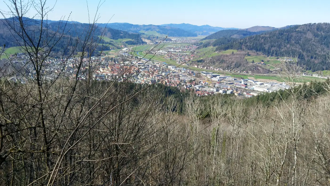 Nach der wohlverdienten Pause setzen wir den Anstieg fort. Der Weg wird nun steiler, doch schon bald erreichen wir den Urenkopfturm. Der Aussichtsturm ist 34 Meter hoch und thront auf 554 Metern Höhe. Nachdem wir die 185 Stufen erklommen haben, erwartet uns eine atemberaubende Rundumsicht: Wir blicken über die sanften Hügel des Schwarzwalds, hinab ins Kinzigtal und bei klarer Sicht sogar bis zu den Vogesen im benachbarten Frankreich.KZ-Gedenkstätte Vulkan