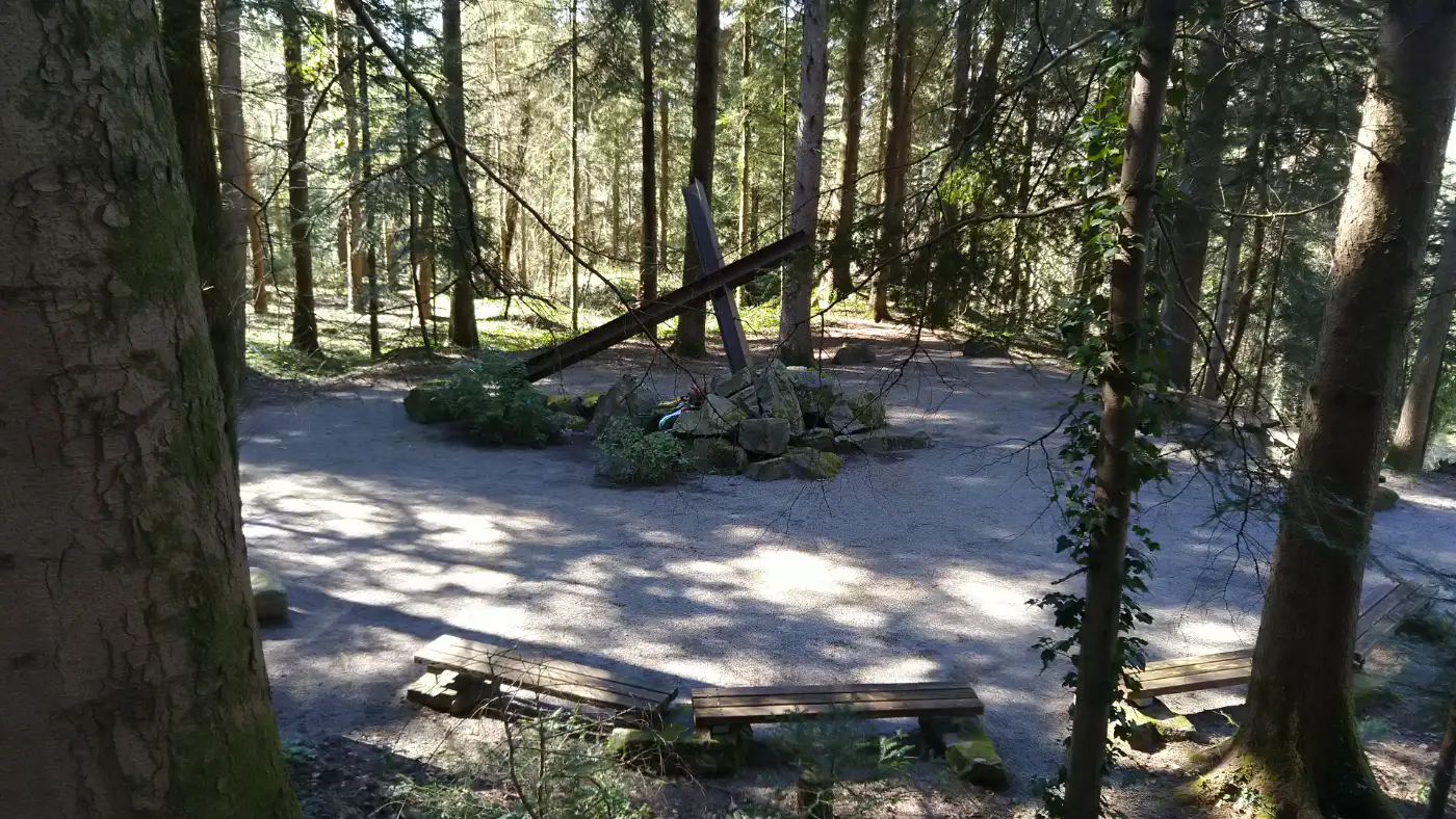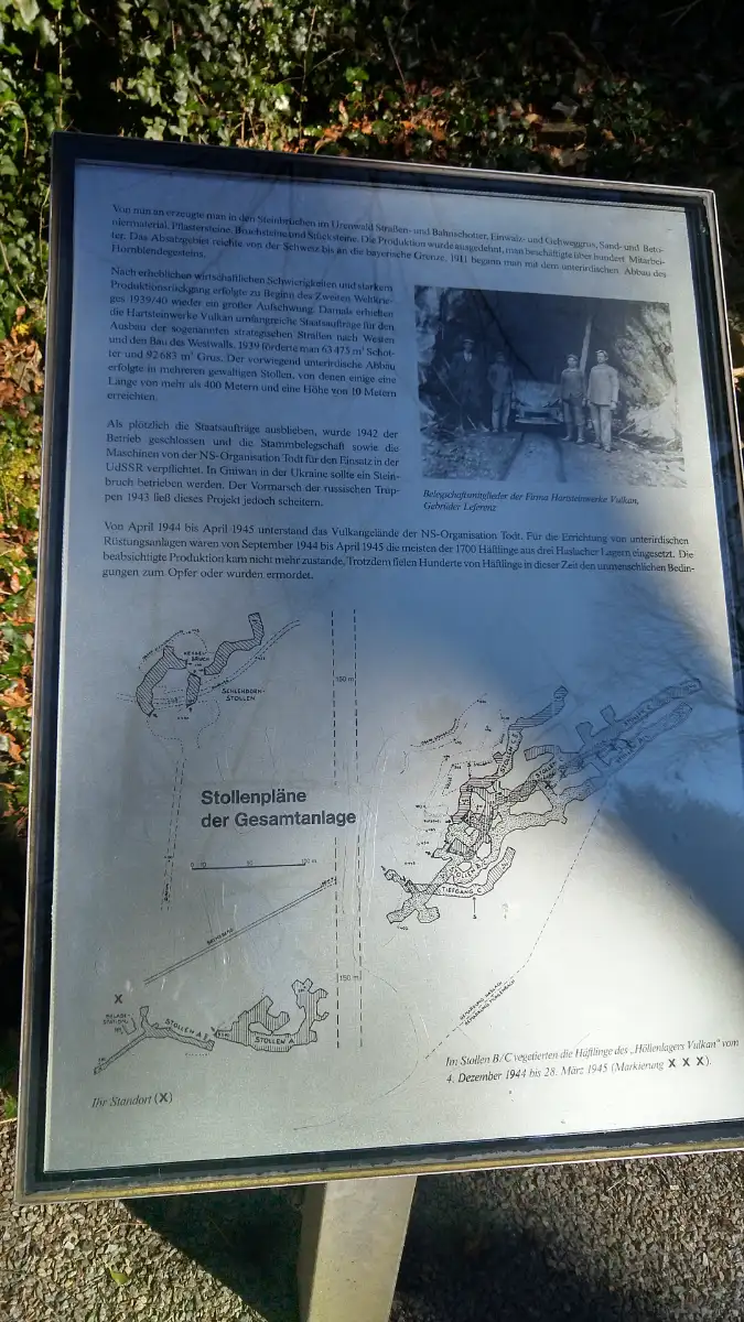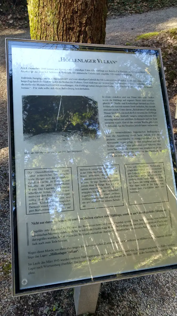 Für den Rückweg wählen wir eine andere Route, die uns zur KZ-Gedenkstätte Vulkan führt. Diese Gedenkstätte erinnert an das ehemalige Außenlager des Konzentrationslagers Natzweiler-Struthof, das sich hier während des Zweiten Weltkriegs befand. Die Ruinen und Informationstafeln geben Einblicke in die tragische Geschichte des Lagers und mahnen zur Erinnerung an die Opfer.