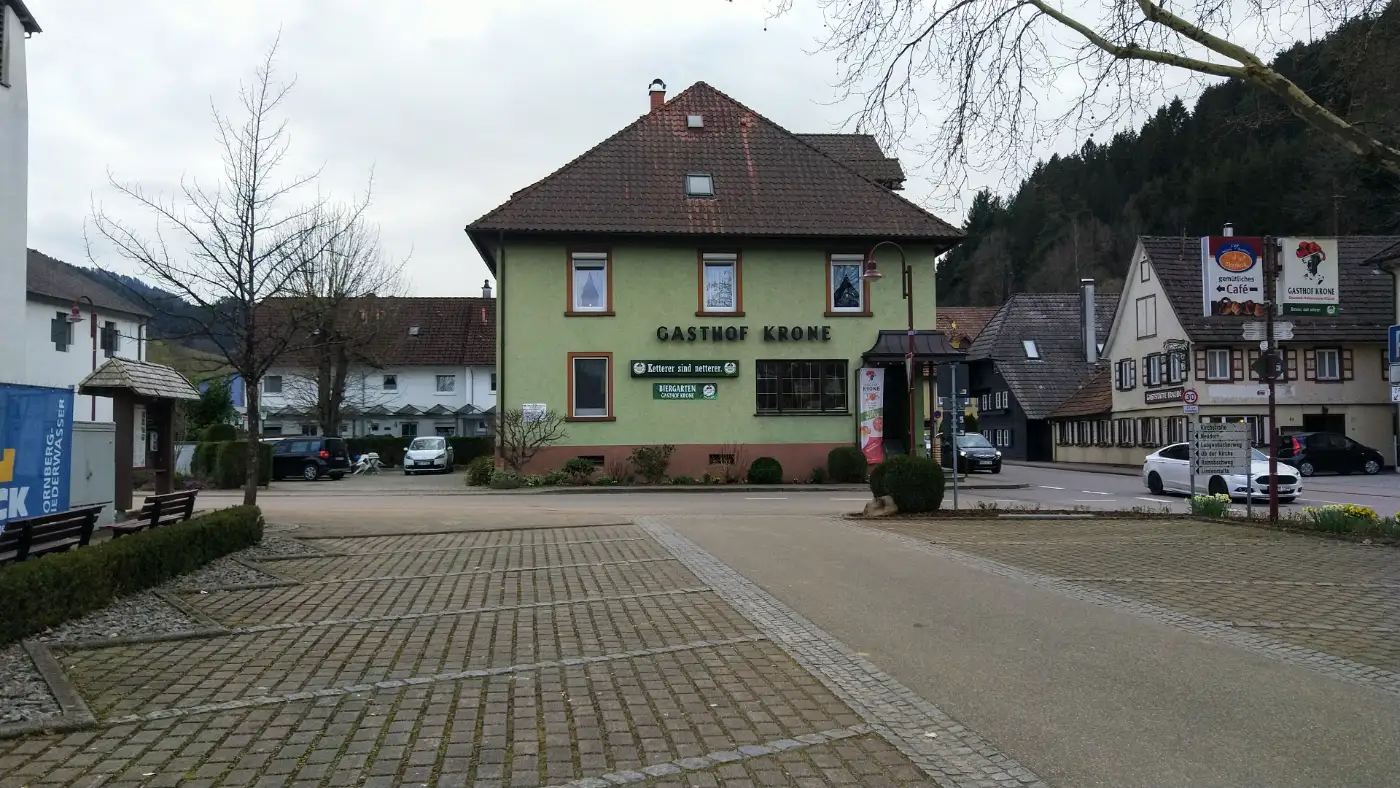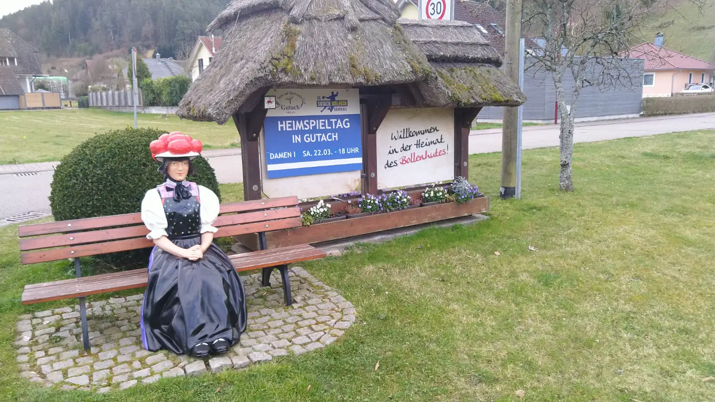 Wir folgen dem Weg weiter in den Ort Gutach und gelangen schließlich auf die Hauptstraße, wo sich rechterhand der traditionsreiche Gasthof Krone befindet - eine gute Gelegenheit für eine Einkehr mit regionalen Spezialitäten. An diesem Punkt haben wir mehrere Möglichkeiten, die Wanderung flexibel zu beenden. An der Hauptstraße gibt es eine Bushaltestelle, von der aus regelmäßig Busse nach Hausach fahren, oder wer noch genug Energie hat, kann die Tour verlängern und in wenigen Kilometern das bekannte Schwarzwälder Freilichtmuseum Vogtsbauernhof erreichen. Dort erhalten Besucher einen spannenden Einblick in das traditionelle Leben und die Architektur des Schwarzwalds.