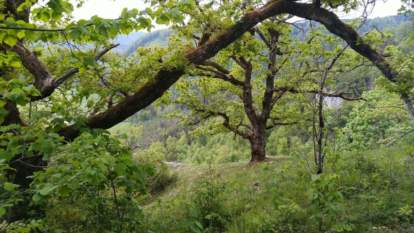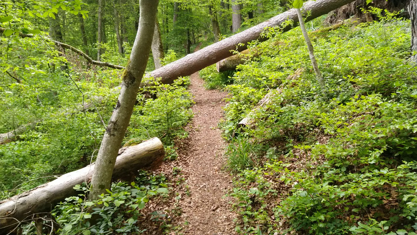 Nun beginnt der teils steile Abstieg ins Finstertal, ein schattiges, wildromantisches Seitental der Donau. Der Pfad schlängelt sich durch moosbewachsene Felsen und dichten Mischwald talwärts.Schreyfelsen Kletterroute
