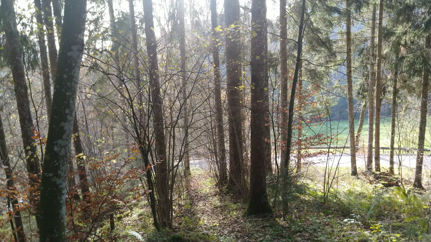 Kurz vor Eschach biegen wir links auf einen steiler werdenden Pfad ab. Ein Wegweiser mit der Aufschrift Premiumweg Krottenbachschlucht zeigt uns die Richtung - doch der Name darf nicht darüber hinwegtäuschen, dass dieser Abschnitt alles andere als gemütlich ist. Im Gegenteil: Der schmale Steig fordert mit rutschigen Passagen, Wurzelstufen und kleinen Hangquerungen unsere volle Aufmerksamkeit. Nach rund 200 Höhenmetern erreichen wir eine kleine Hütte und ein schlichtes Wegkreuz, die idyllisch im Wald am rauschenden Bach liegen - ein idealer Platz für eine kurze Verschnaufpause. Dort sammeln wir neue Kraft, bevor wir dem schmalen, stellenweise rutschigen und abschüssigen Krottenbachweg weiter folgen. Eine alte Holzbrücke bringt uns über den Bach und ein Stück näher an den Eichberg heran.Der Eichberg