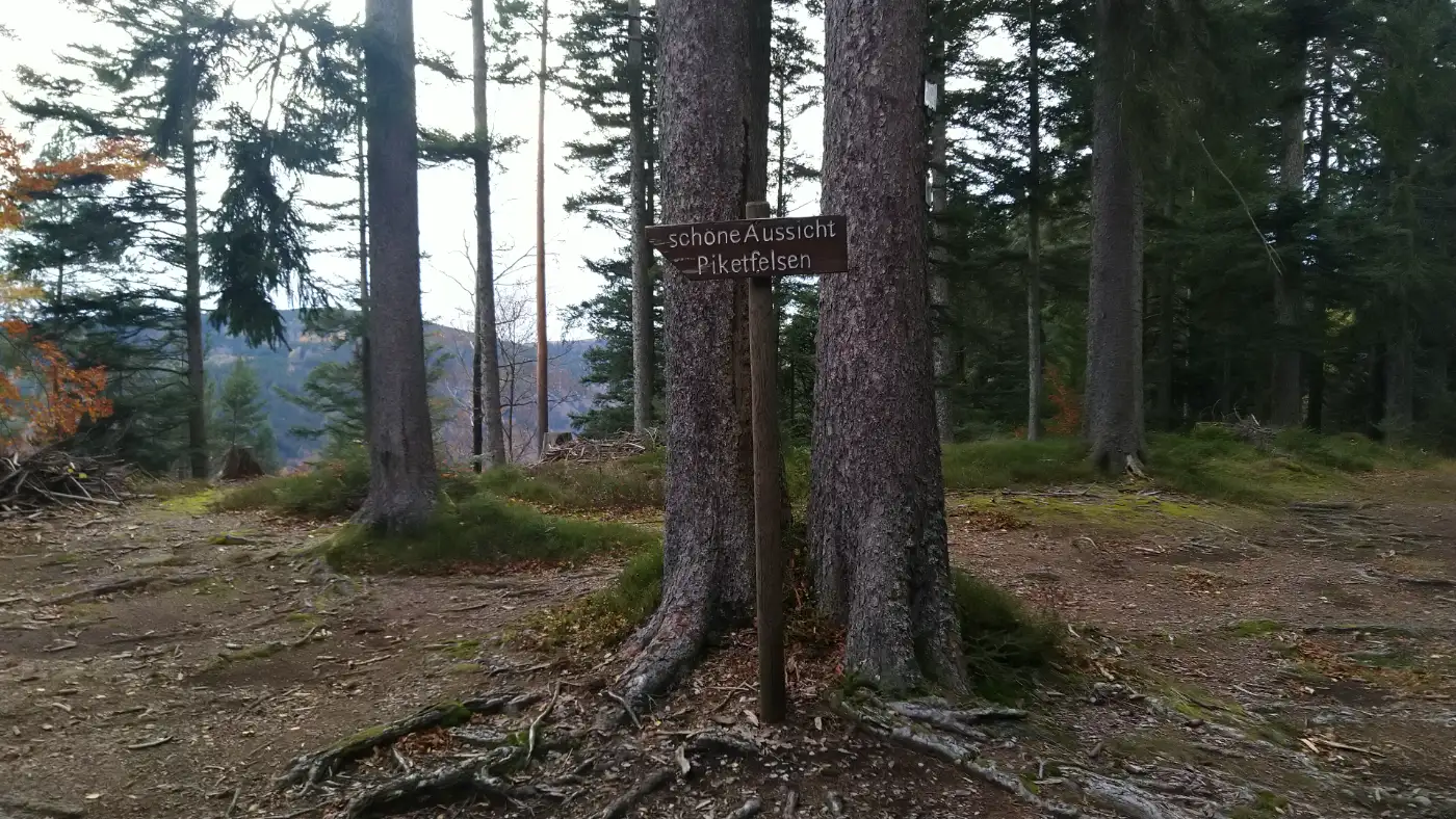 Ein kurzer Abstecher führt uns zum großen Posthaldefelsen, von dem sich ein eindrucksvoller Blick über das Höllental bietet. Tief unter uns windet sich die Höllentalstraße, während über den bewaldeten Höhen der Blick bis zum Feldberg reicht. Die Weite dieses Panoramas fasziniert immer wieder aufs Neue - ein stiller Ort, an dem man die Kräfte der Natur spürt und die Gedanken frei werden.Der Piketfelsen