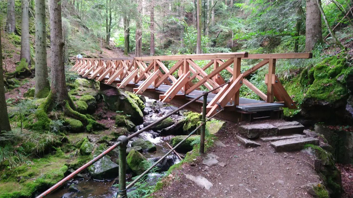 Am Fuße der Ravennaschlucht erwartet uns mit dem Hofgut Sternen ein Ort, an dem Schwarzwälder Tradition, Geschichte und Handwerk lebendig werden. Hier können Besucher die Glasmanufaktur erleben, wo kunstvolle Glaskreationen vor den Augen der Gäste entstehen. Das Goethehaus, in dem der berühmte Dichter einst zu Gast war, gibt Einblick in die lange Geschichte des Hofguts. Das Hofgut versorgt sich vollständig mit nachhaltiger Energie aus eigener Produktion und setzt auch kulinarisch auf Regionalität: In der Hofgut-Küche werden saisonale Spezialitäten in gemütlicher Schwarzwald-Atmosphäre serviert. Ein perfekter Ort für eine Pause, bevor die Wanderung weitergeht - oder um den Tag bei gutem Essen ausklingen zu lassen. Gleich daneben beeindruckt das mächtige Ravennaviadukt der Höllentalbahn, das sich elegant über die Schlucht spannt.Die Ravennaschlucht
