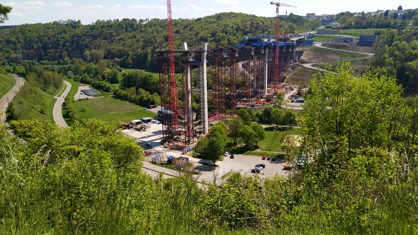 Wir bleiben auf der Neckarstraße, passieren das Lotzerhaus und folgen dem Straßenverlauf weiter in Richtung Friedhof. Dort angekommen, biegen wir links ab und gehen entlang des Friedhofs einen schmalen Pfad bergauf. Dieser führt uns zur Stuttgarter Straße, die wir ein Stück hinaufwandern, bis sich die erste Möglichkeit bietet, rechts abzubiegen.Baustelle der neuen Neckartalbrücke