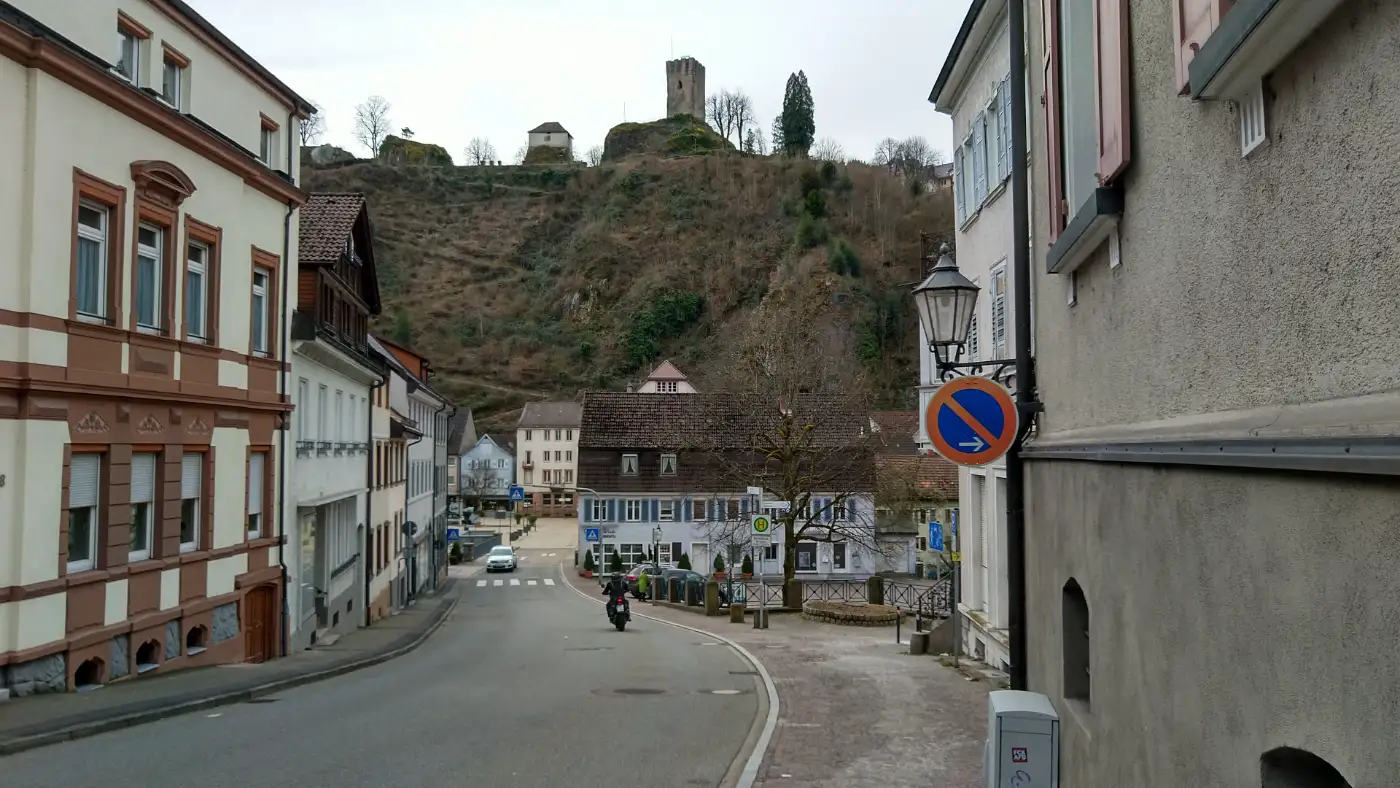 Am Markgrafenhof angekommen, führt uns unser Weg durch eine kleine Unterführung unter den Bahngleisen auf die andere Seite des Tals. Nun befinden wir uns auf dem Rebbergweg, einem schmalen Pfad, der uns in einer Zickzack-Route nach oben leitet. Dieser Weg verlangt etwas Kondition, belohnt uns jedoch mit herrlichen Ausblicken auf Hornberg, die umliegenden Hügel und die majestätische Burg Hornberg, die hoch über der Stadt thront.Teufelstritt Schalenstein