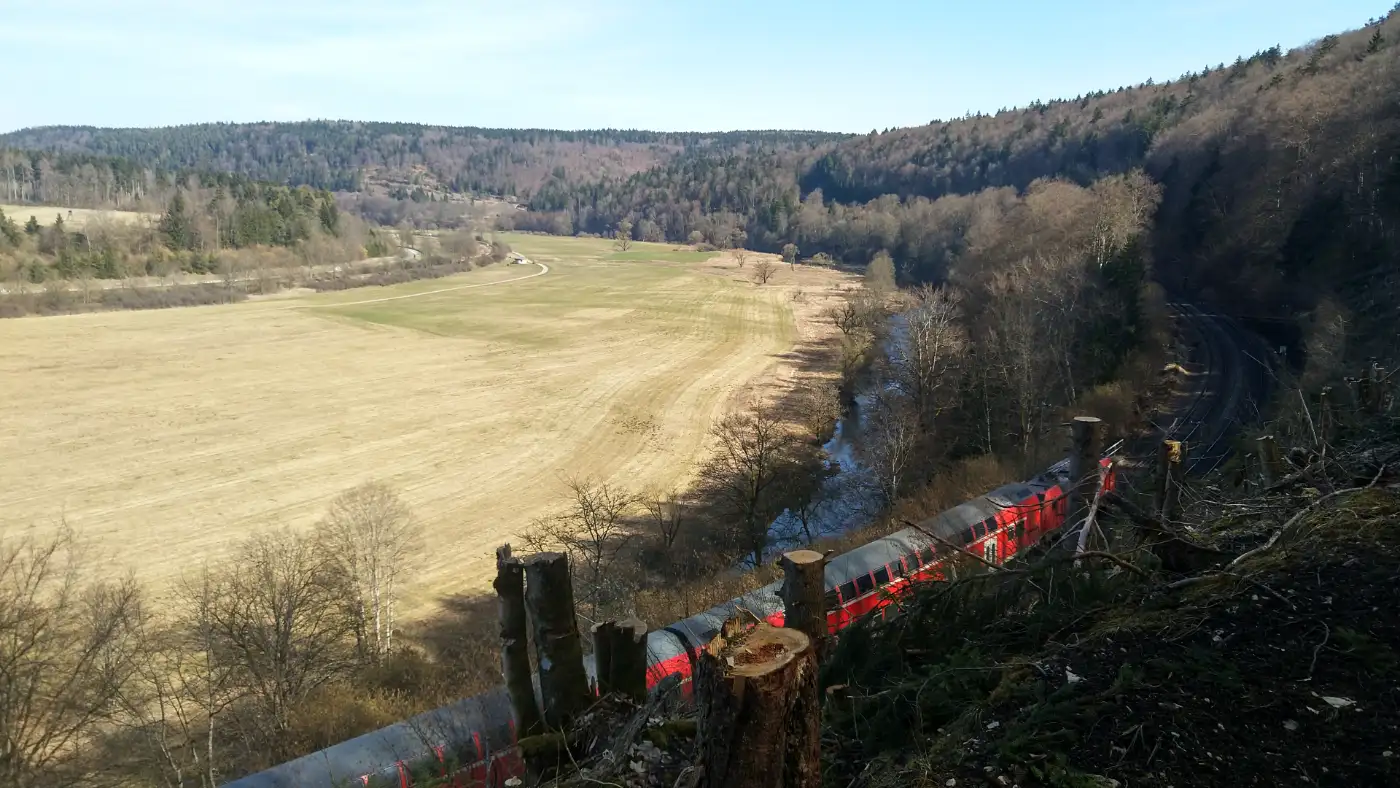 Panoramareiche Wanderung zu Flussversickerung und aussichtsreichen Höhen. Naturpfade und weite Blicke über Hegau und Donautal begleiten die Strecke. Wir beginnen unsere Rundwanderung am Bahnhof von Immendingen und folgen zunächst der Schwarzwaldstraße bis zum Kreisverkehr. Dort biegen wir rechts ab und halten uns in Richtung Donau. An den Immendinger Wasserfällen vorbei nehmen wir Kurs zur Donauversickerung in der Nähe von Möhringen. Dort verschwindet ein Teil des Flusswassers im porösen Kalkgestein der Schwäbischen Alb und setzt seinen Weg unterirdisch fort. Besonders in den trockenen Sommermonaten kann die Donau hier an vielen Tagen vollständig versickern, sodass das Flussbett teilweise trocken fällt. In wasserreichen Zeiten - etwa im Winter oder nach starken Regenfällen - führt der Fluss dagegen genug Wasser, sodass nur ein Teil im Untergrund verschwindet und der Rest oberirdisch weiterfließt.Eisenbahnviadukt